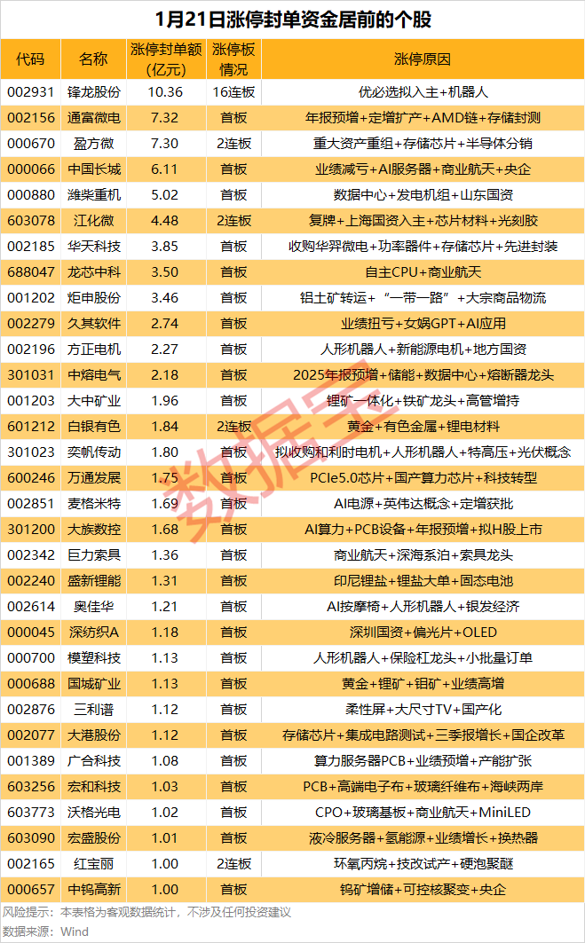 截至今日(1月21日)收盘,上证指数报收4116.94点,上涨0.08%;深证成指收于14255.13点,上涨0.70%;创业板指上涨0.54%;科创50指数上涨3.53%。 不含未开板新股,今日可交易A股中,上涨个股超3000只,占比超56%,下跌个股有2197只。其中,收盘封死涨停的有88只,跌停股有11只。另外,36股封板未遂,整体封板率为70.97%。 据证券时报·数据宝统计,封死涨停的个股中,以所属行业来看,涨停股数量居前的行业有电子、机械设备、汽车,分别为17股、8股、8股。 在封死涨停的个股中,*ST恒久、*ST立方等9股为ST股。从连续涨停天数看,锋龙股份已连收16个涨停板,连续涨停板数量最多。 以封单金额计算,锋龙股份、通富微电、盈方微涨停板封单资金居前,分别为10.36亿元、7.32亿元、7.30亿元,后两股均涉及存储概念。此外,还有华天科技、大港股份等存储概念股封单金额居前。 从封单力度(封单量占流通A股比例)来看,炬申股份、盈方微、奕帆传动力度较大,分别为14.68%、9.5%、7.7%。