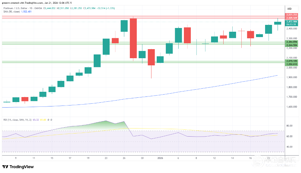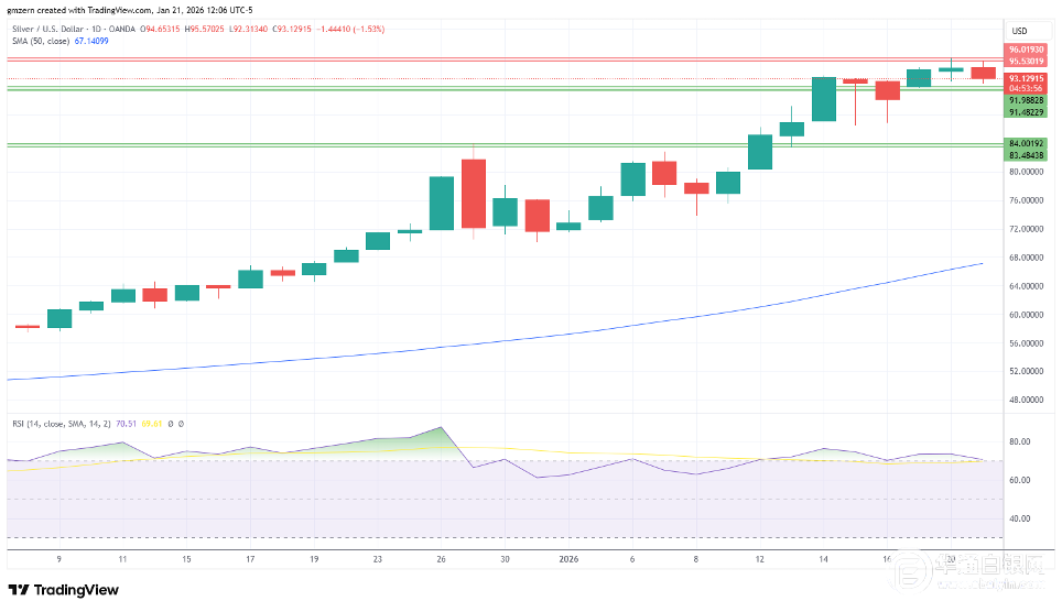 金银比攀升至52.00关口附近,银价出现回落。近期交易时段内,上升的金银比给银价带来了一定压力。 倘若白银价格跌破91.50美元至92.00美元支撑位,则将会向87.00美元移动。 铂金