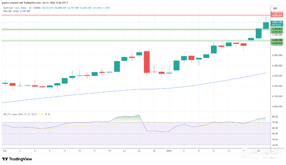 黄金价格创下新高,原因是交易员们关注了特朗普在达沃斯发表的言论。不过,交易员们已经开始部分获利了结。 如果黄金能够突破4890至4900美元阻力位,则将朝着重要心理水平5000美元价位迈进。 白银