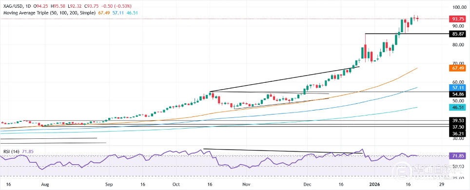 【华通白银网1月22日讯】•在特朗普表示愿意与丹麦就格陵兰岛问题进行谈判后,白银价格下跌超1%。 •相对强弱指标(RSI)脱离超买区域,暗示在经历了抛物线式上涨后势头正在减弱。 •多头瞄准95.86美元和100.00美元,而90.00美元仍是关键的下行支撑位。 白银价格周三出现回调,此前其曾达到日高点95.56美元,因美国总统特朗普在达沃斯演讲中缓和了语气,表示他准备与丹麦就格陵兰岛问题进行谈判。截至撰写本文时,白银的交易价格为93.57美元,较周二创下的95.89美元的历史高点下跌了超过1%。 白银价格预测:技术展望 白银日线图显示其整体维持上行倾向,但此前抛物线式上涨动能已出现停滞,相对强弱指标(RSI)已脱离超买区域,并显示出背离信号。 尽管如此,空头尚未完全摆脱困境,空头必须首先突破90.00美元关口,才能进一步挑战1月15日触及的近期周期低点86.45美元。若86.45美元支撑失守,白银价格可能跌向20日简单移动均线所在的80.63美元水平。 白银日线图