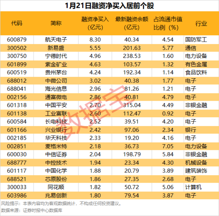 公司是一家专业从事高温工业用耐火材料整体解决方案的高新技术企业,为客户提供耐火材料整体承包服务及耐火材料产品。 44股融资净买入超亿元 截至1月21日,市场融资余额合计2.70万亿元,较前一交易日增加115.51亿元。 具体到个股,1月21日共有1851只股获融资净买入,其中44只融资净买入额超亿元。航天电子融资净买入额居首,当日净买入8.30亿元,其次是新易盛、宁德时代,融资净买入金额分别为5.55元、4.96亿元,融资净买入金额居前的还有紫金矿业、贵州茅台、中微公司等。 分行业统计,获融资客净买入超亿元个股中,电子、机械设备、电力设备等行业最为集中,分别有14只、4只、3只个股上榜。