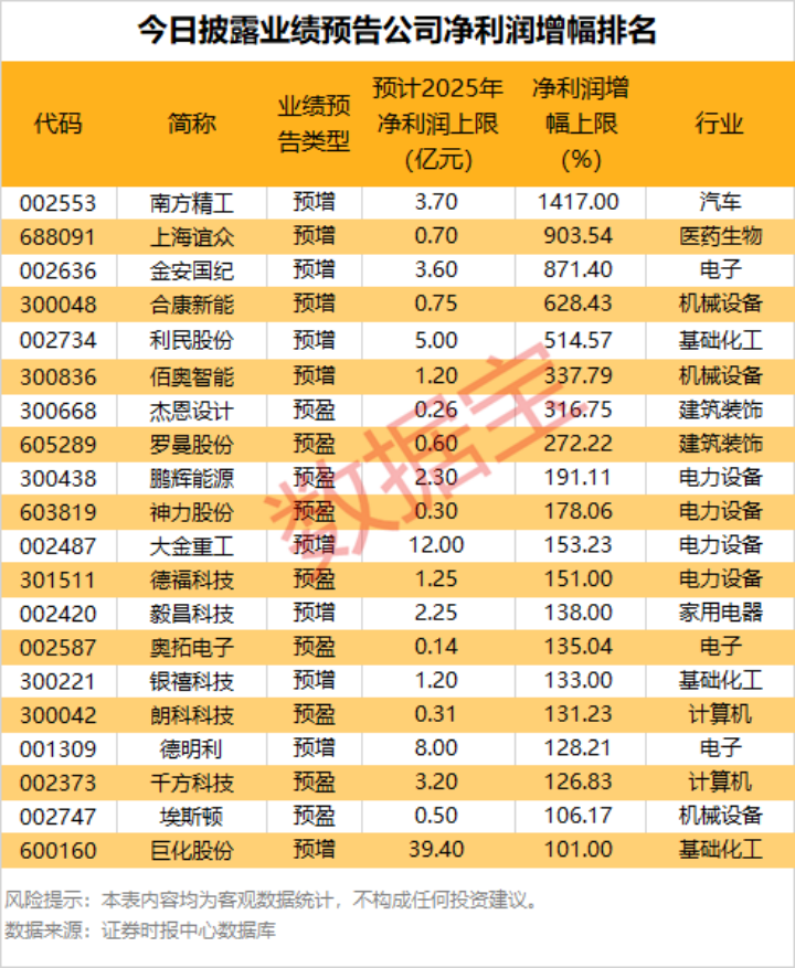 最新业绩大增股名单:20股净利润增幅超100% 统计显示,今日共3家公司公布业绩快报,兴业银行、苏农银行均实现营收及净利润双增长,兴业银行2025年实现净利润774.69亿元,同比增长0.34%,苏农银行2025年净利润为20.43亿元,同比增长5.04%。苏垦农发2025年净利润为5.54亿元,同比下降24.17%。 今日公布业绩预告的有65家,业绩预告类型来看,预增22家,预盈9家。以预计净利润增幅上限统计,共20家公司净利润增幅超100%。 净利润同比增幅最高的是南方精工,公司预计2025年净利润为3亿元至3.7亿元,同比增长1130%至1417%。业绩增长主要源于公司对持有的江苏泛亚微透科技股份有限公司等投资项目进行了公允价值评估,产生的公允价值变动收益在本报告期对公司税前利润的影响金额预计为3亿元至3.2亿元之间。