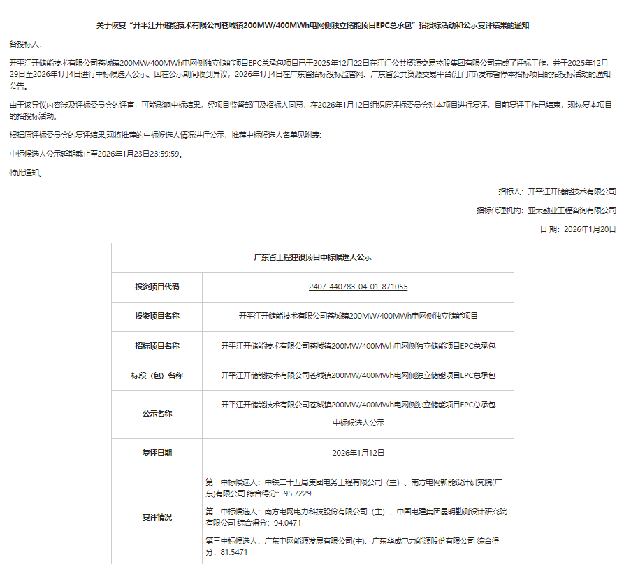 北极星储能网讯:2026年1月20日,广东开平苍城镇200MW/400MWh储能项目EPC中标候选人调整,由南网科技与中国电建昆明院联合体,变更为中铁二十五局与南方新能院。 2025年12月1日,招标人开平江开储能技术有限公司发布200MW/400MWh的电网侧独立储能项目EPC招标。该项目位于广东省江门市苍城镇内的220kV湾琴变电站东南侧,配套建设220kV储能升压站1座。招标要求设备集成商至少具备电池单体、电池模组、PCS、BMS、EMS的其中两项产品的研发及生产能力,并提供相关产品的第三方型式试验报告。 该项目于2025年12月29日发布中标候选人公示,第一名为南方电网电力科技股份有限公司及中国电建集团昆明勘测设计研究院有限公司联合体,报价为38292.631366万元,第二第三名分别为中铁二十五局集团电务工程有限公司与南方电网新能设计研究院(广东)有限公司联合体、广东电网能源发展有限公司与广东华成电力能源股份有限公司联合体,报价分别为39077.18652万元、38486.117804万元。 其中南网科技、南方新能院、广东电网能源发展有限公司,均为南方电网旗下公司。 随后,招标人在2026年1月4日发布暂停公告。公告中指出:因在公示期间收到异议,现按有关法律法规的规定,暂停该项目的招投标活动。 直至2026年1月20日,招标人发布恢复招投标活动,并公示复评结果。调整后的结果显示,第一中标候选人由“南方电网电力科技股份有限公司(主)、中国电建集团昆明勘测设计研究院有限公司”,现变更为“中铁二十五局集团电务工程有限公司(主)、南方电网新能设计研究院(广东)有限公司”,这也意味着此次招标的最终中标价格从之前的38292.631366万元变更为39077.18652万元,单价约0.9573元/Wh变为0.9269元/Wh。 原文如下: