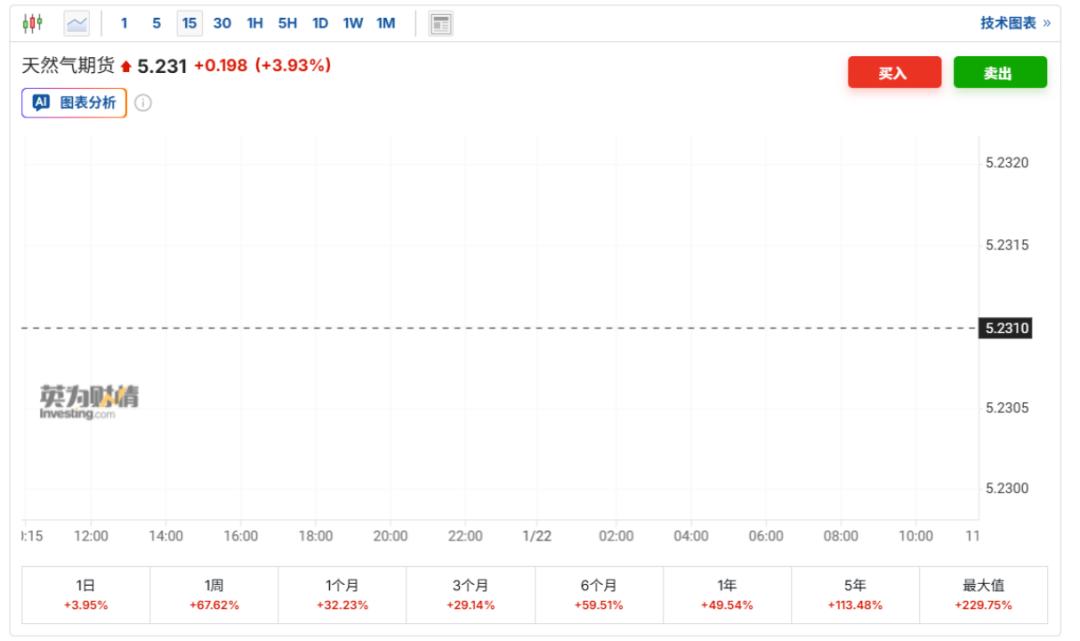 天然气板块迎来爆发! 1月22日早盘,能源板块表现非常强势,天然气概念尤其抢眼。蓝焰控股开盘之后直线拉升,并于9:32封死涨停板,胜利股份盘中涨停。特瑞斯一度大涨超20%,中泰股份大涨超15%。大盘股中国海油、中国石化、中国石油皆有不错涨幅。 欧洲天然气价格自去年6月以来首次触及每兆瓦时40欧元,基准期货周三一度飙升11.5%,将今年以来的强劲涨势推高至40%以上。继上个交易日盘中暴涨逾28%后,昨晚美国天然气期货近月合约盘中再度涨逾30%。NYMEX天然气期货涨至5美元,为去年12月份以来首次。 那么,究竟发生了什么? 能源股爆发 随着地缘政治不确定性上升促使投资者押注油价走高,过去几个月里强劲上涨的美股能源板块已攀升至历史新高。昨晚,美股能源板块一度大涨近3%,有49只股票涨幅超过5%。标普500能源指数最终收于750.17点,成为标普500指数中表现最好的板块。近期,天然气期货亦是连续大涨,目前已经突破5美元,过去一周涨幅超过67%。