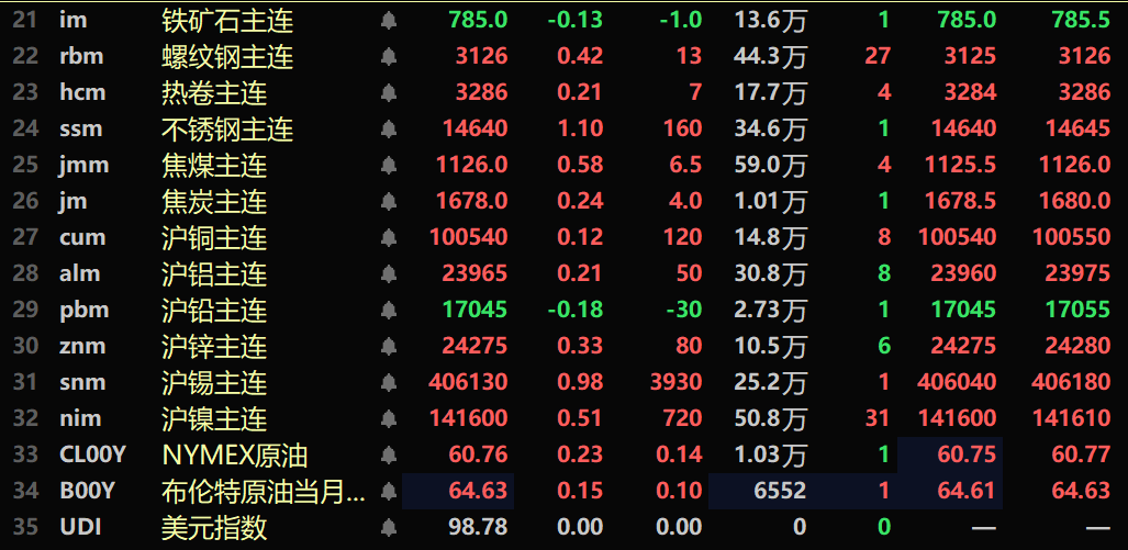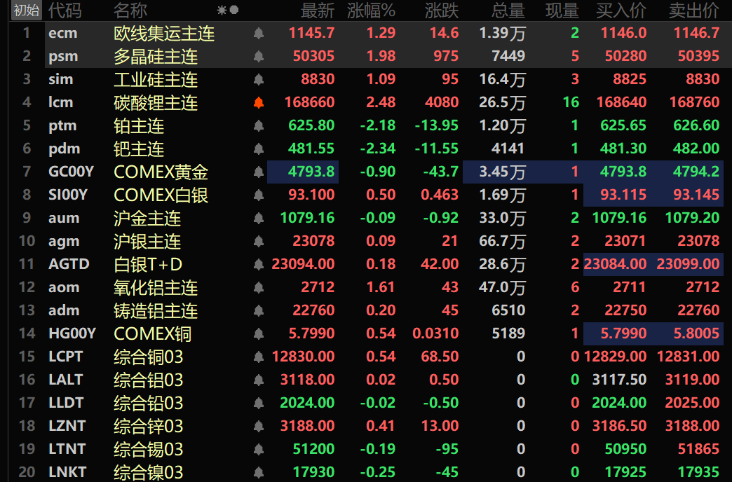 SMM1月22日讯: 金属市场方面: 截至午间收盘,内盘基本金属近全线上涨,沪铜涨0.12%。沪铝涨0.21%。沪铅跌0.18%,沪锌涨0.33%。沪锡涨0.98%。沪镍涨0.51%。 此外,铸造铝主连期货涨0.2%,氧化铝主连涨1.61%。碳酸锂主连延续前2个交易日的涨势继续涨2.48%。工业硅主连涨1.09%。多晶硅主连涨1.98%。 黑色系多飘红,铁矿跌0.13%,螺纹涨0.42%,热卷涨0.21%,不锈钢涨1.1%。双焦方面:焦煤主力合约涨0.58%,焦炭主力合约涨0.24%。 外盘基本金属方面,截至11:42分,LME金属涨跌互现。伦铜涨0.54%。伦铝涨0.02%。伦铅跌0.02%。伦锌涨0.41%。伦锡跌0.19%。伦镍跌0.25%。 贵金属方面,截至11:42分,COMEX黄金跌0.9%,COMEX白银涨0.5%。内盘贵金属方面:沪金主连跌0.09%,沪银主连涨0.09%。高盛将黄金今年底目标价从每盎司4900美元上调至5400美元,理由是私人部门投资者和中央银行对黄金的需求不断增长。高盛分析师在报告中指出,预计各国央行今年每月将购买60吨黄金,同时随着美联储降息,黄金ETF的持有量也将增加。高盛分析师称,各国央行已开始通过传统的ETF,与私人部门投资者争夺有限的黄金。 此外,截至午间收盘,铂主连期货跌2.18%,钯主连期货跌2.34%。 截至午间收盘,欧线集运主力合约涨1.29%,报1145.7点。 截至1月22日11:42分,部分期货午间行情: