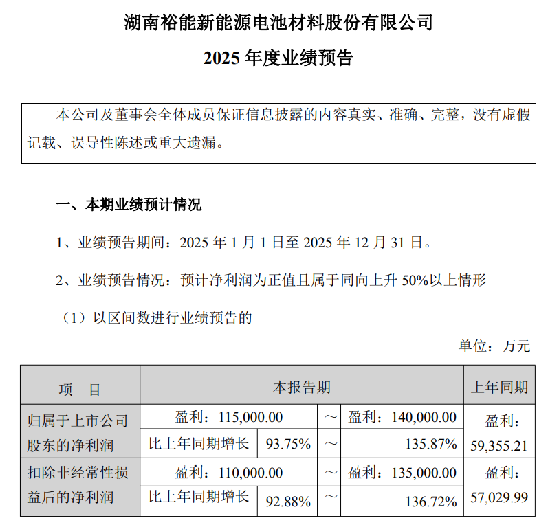 SMM 1月22日讯:1月19日,湖南裕能发布2025年业绩预告,公告显示,公司预计2025年度归属于上市公司股东的净利润为11.50亿元-14.00亿元,比上年同期增长93.75%-135.87%。