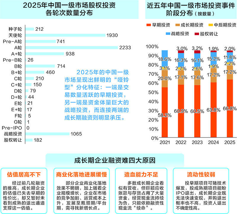 证券时报记者 卓泳 “以前总说‘C轮死’,没想到这么多年过去,这个魔咒还是没被打破。”近期一位投资人的感慨,戳中了成长期创业企业的集体痛点。 在创投市场,如今已呈现哑铃式融资格局:早期项目靠技术故事吸引资本,成熟期企业凭稳定业绩冲击IPO,而成长期企业却卡在一个“中间地带”:既没了早期估值的吸引力,又还没具备成熟期的流动性与“造血”能力,融资难成为横在它们面前的一道鸿沟。这道鸿沟为何迟迟难以填平?有何破局之道?值得整个行业静下心来深思。 B轮成了“融资坎” “去年我们看了约200个成长期项目,没有一个能达到我们的投资安全边际,最终一个都没法出手。”融创投资创始合伙人赵俊峰无奈说道。在他看来,所谓的“投资安全边际”,即企业拥有正向经营现金流,而非账面上不断累积的应收账款与大量存货,不然就不是高质量增长的表现。 华南一券商资深投行人士解枫(化名)对此有同感:“我接触过不少这类卡在中间的企业。比如一家做非侵入式脑机接口的公司,产品性能已达标,但偏偏卡在商业化落地很难推进,没有医疗渠道和经销商资源,量产又需要大额预付资金,资金压力陡增。结果就是B轮之后,早期投资人不敢继续加注,后续资金方也望而却步。” IT桔子数据显示,作为连接早期创新与后期整合的关键桥梁,成长期与中后期融资正经历严峻考验。从金额看,成长期投资占比从2021年的32.6%断崖式下滑至2025年的19.6%;中后期投资占比更从16.3%减半至7.9%。 从传统的融资轮次看,B轮正是划分早期与成熟期的一道隐形分水岭,也成了很多企业的“融资坎”。这个阶段企业的“画像”是:早已脱离纯粹的概念期,技术与产品进入商业化落地阶段,不少企业已手握订单、实现营收;估值也较早期企业大幅抬升。从融资诉求看,它们不再满足于单纯的资金注入,更渴望能带来订单、客户与应用场景的战略投资方,但这种“精准匹配”的需求,也恰恰加剧了其融资难度。 “C轮死”魔咒背后四大症结 事实上,创投行业一直流传着“C轮死”的魔咒,直至今天,这一定律仍在各个风口板块的企业中不断被印证。在常人看来,这类企业有技术、有产品、有商业模式,风险较早期项目已显著收敛,但为何偏偏不受资本青睐?又是什么让它们陷入“不上不下”的融资尴尬? “早期投资看赛道、团队与对标公司,对财务指标要求宽松;但从B轮开始,投资人的目光就转向了产品落地、订单履约、渠道搭建等实打实的经营数据。”解枫表示,随着企业发展,不仅企业对资本的偏好在变,资本对企业的评判标准也愈发务实。 看过上百家这个阶段的企业,赵俊峰总结出“出不了手”的四个主要症结:一是估值居高不下。经过前几轮融资的推高,成长期企业的估值已失去早期的性价比,却又暂时未看到成熟的退出通道支撑这一估值。二是商业化落地进展缓慢。部分企业商业化落地效果不明朗,加上随着企业规模增长,企业在市场的竞争加剧、运营成本上升,发展至瓶颈期/平台期,需寻找新增长点。三是造血能力不足。多数成长期企业看似有营收,但巨额应收账款与存货占用了大量资金,经营现金流持续为负,只能依赖融资性现金流“续命”。四是流动性较弱。对投资人而言,投早期项目可赌技术爆发,投成熟期项目能盼IPO退出,而成长期企业既无法快速变现,并购退出的概率也不高,投资人退出的不确定性高。 更值得关注的是,随着中国经济进入后工业化阶段,传统制造业与先进制造领域的成长期企业,更多面临的是成本的竞争,而非技术创新的竞争。赵俊峰坦言,这类企业的技术已基本定型,主要依赖工艺进步降低成本,但在规模上远不及行业巨头,既没有早期企业的技术爆点,也没有成熟期企业的成本优势,自然难以获得资本青睐。 资本要看到市场打开才敢投,企业要靠资本才能打开市场。这实际上是一个悖论,解枫坦言,在当前市场不确定性较高的环境下,资本更倾向于“分批投资、观察后再追加”,但成长期企业的量产与市场拓展恰恰需要大额、持续的资金投入。这种诉求与供给的错配,让不少企业卡在“需要钱却融不到钱”的死循环中。 金融工具、产业资本需协同发力 “现在‘C轮死’的问题还是比较严重的,企业想融、资本也想进,就是估值谈不拢。”高捷资本创始主管合伙人黎蔓在接受媒体采访时直言。在他看来,众多因素中,估值预期与实际价值的严重不匹配,是导致成长期企业融资受阻的关键症结。 破解的核心在于,接受企业发展不达预期之下的估值折价。“我们在美国支持过这样一家公司,他们在A轮之后,投资人都跑了,因为没有达到预期的估值,但我们是唯一一家在B轮支持他们的,前提是我们把估值谈得比较低。”黎蔓分享,在美国的风投圈有个统计,在经济不好的时候,Down Round(折价融资)占了所有融资事件的三分之一,企业愿意接受降低估值。他认为,这一点正是中国创业者与创投机构需要革新的方向。 另外,从行业端看,不同赛道的成长期企业境遇也会有一定的差异。赵俊峰发现,纯技术研发型、具有明确时间维度里程碑的行业相对乐观,比如创新药按临床阶段推进估值、商业航天靠发射成功率积累壁垒,这类企业的成长与估值成正比,更容易获得资本持续支持。但对于大多数传统制造与普通先进制造企业而言,市场已进入饱和阶段,缺乏足够的增长空间,高估值就更