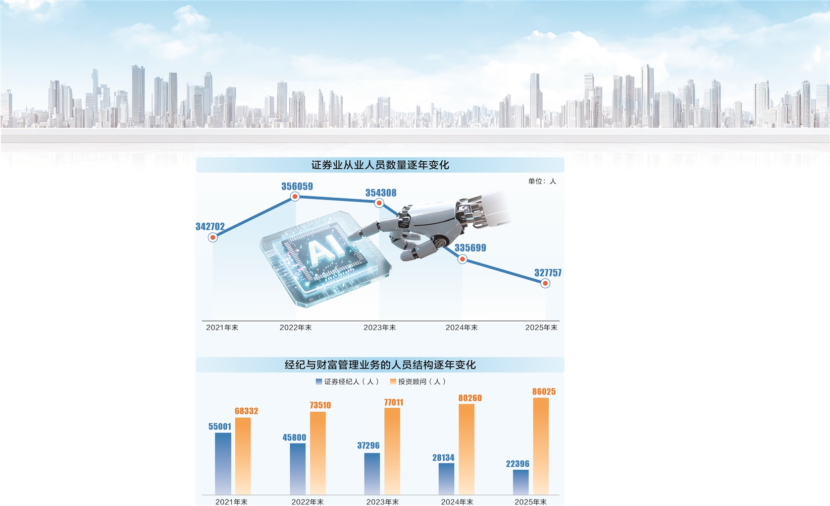 证券时报记者 王蕊 谭楚丹 孙翔峰 2025年证券从业人员数量跌破33万人,同比减少近8000人;过去三年,全行业有近3万名从业者离场,主要业务岗位的人才结构也随之调整。在业内人士看来,背后原因是行业价值锚点的变化。 国金证券人力资源部相关人士表示,人员结构的“有增有减”,实际上是行业底层逻辑发生变革:人才的价值正从过去的“关系与牌照驱动”转向未来的“专业与服务驱动”。 证券时报记者通过多方调研,试图厘清三大问题:从业者为何选择离开?行业对人才价值的要求发生了哪些变化?考核机制如何适配证券行业新的发展理念?这些问题的答案,勾勒出证券公司与从业者在转型关键期面临的发展抉择。 券业人员结构生变 新一届国考面试名单近期公布,含调剂在内,证监会相关岗位共有近1100人入围面试。值得注意的是,2025年证监会系统录用的公务员中,来自证券行业的从业人员占比明显提升。 通过“考公”转换职业赛道,是证券行业人才流动的路径之一。过去一年,证券行业人才职业选择多元:既有履历亮眼的保代转任上市公司董秘,也有光鲜的卖方分析师跳槽至买方,更有行业明星试水知识付费成为网红,还有从业者转行投身教培、餐饮、保险等领域。 当行业从高速扩张转向高质量发展,从业人员流动更加明显。中国证券业协会数据显示,证券业从业人数连续3年下滑,从2022年末35.61万人,减少至2025年末32.78万人,近3万人离场。 从人员结构来看,“一般证券业务”从业人员已连续两年减少超2万人。东方财富Choice数据显示,投顾与分析师群体保持持续增长,2018至2025年的8年间,两类人员分别累计增长逾4万人、逾3000人;而保荐代表人数量在连续多年增长后,于2025年首次出现净流失。 “本质是传统‘通道+人海’模式向‘专业+科技’模式的升级。”财通证券相关人士这样总结这些年的证券从业人员流动。 华福证券首席人力资源官张永钦也有相似观点。他认为,这是行业从传统通道模式向财富管理、综合金融服务深度转型的必然结果,是注册制改革、买方投顾转型、金融科技渗透及客户需求综合化等多重因素共同作用,推动行业从“流量驱动”转向“专业与价值驱动”。 人员结构的调整已在行业效能上有所体现。以经纪与财富管理业务为例,中国证券业协会在2025年7月向券商下发的报告中指出,经纪业务人员的结构性调整带来人均营业收入在连续两年下降后企稳回升,表明行业通过压缩低附加值岗位、强化高价值服务能力,实现了人力成本降低与经营效率提升的双重目标。 四类人才紧俏 证券公司业务模式迎来转型,证券行业的人才价值定义也随之改变。过往依赖牌照红利与关系资源的“旧船票”,已难登上驶向行业未来的新船,从业人员在这场变革中,急需实现技能与角色的双重升级。 作为头部券商,华泰证券认为,当前人才要有跨界融合、创新引领、协同赋能的特质。券商不仅需要金融专才,更需要深刻理解业务场景、运用科技手段创造价值的复合型人才;人才不仅是战略执行者,更是推动业务变革、探索新模式的伙伴,需要数字化思维、创新勇气及解决复杂问题的能力;同时,在数字化和国际化进程中,人才的敏捷、协同与赋能能力将变得愈发重要。 上述判断引发行业共鸣。前述财通证券相关人士概括人才价值演变的四个维度,即从“执行者”到“架构师”、从“经验驱动”到“科技赋能”、从“单兵作战”到“协同合作”、从“关系维护”到“生态共建”。 对从业人员而言,这意味着要具备跨部门协作能力、深度理解客户需求能力、熟练运用金融科技手段的能力等。对于增量人才而言,上述业内共识也明确“准入要求”。 通过对多家券商调研,证券时报记者发现,目前行业内最为紧俏的人才主要为四类: 一是金融科技与数字化人才。比如广发证券计划重点扩张包括交易系统研发人才、AI模型工程师、数据科学家、量化模型工程师等在内的岗位。华福证券则重点吸纳数据治理、算法模型、数字化运营及信息安全等领域的技术精英,驱动业务智能化转型。 二是买方投顾与财富管理专家。目前行业需要具备扎实的资产配置理论、深刻的客户需求洞察、优秀数字化服务工具的买方投顾人才。 三是产业投行与战略咨询人才。前述东吴证券人士提到,在发展新质生产力方面,需要培养和扩充既懂人工智能、生物医药、高端制造等硬科技,又懂风险投资、股权融资的科技金融复合型人才。 “未来对能够进行跨界思考、提供独特产业见解、具备深度研究和资产定价能力、深度协同与赋能的‘智囊型’人才,需求将持续增长。”国金证券人力资源部相关人士表示。 四是国际化与复杂投行专家。张永钦表示,将引进和培养具备国际视野、熟悉全球市场尤其是中国香港资本市场的复合型人才。 “整体而言,人才结构将从‘金字塔形’向以中高端专业人才为主的‘纺锤形’优化。对个人而言,构建‘金融+科技’的复合能力,并将职业重心锚定在AI难以替代的复杂决策、深度关系和创新领域,是应对未来变化的关键。”上述国金证券人士表示。 考核指挥棒转向 伴随券商向综合金融服务转型,行业对人才的能力要求持续提升,如何通过改革考核体系将发展理念转化为实际行动,成为行业内的重要管理课题。 证券时报记者注意到,引导从业人员着眼长期价值