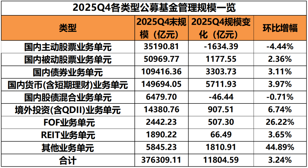 去年四季度A股持续上攻,公募基金规模迎来稳健增长。 截至第四季度末,全市场公募基金管理规模达37.63万亿元,相比第三季度末增长1.18万亿元,增幅为3.24%。值得注意的是,伴随着金价一路上扬,商品类基金规模在第四季度增幅位列各类基金首位。 从非货币基金规模看,易方达基金非货币基金规模为1.65万亿元,位居全市场第一;华夏基金以1.44万亿元名列第二;广发基金以9382.68万亿元位居第三。 商品基金规模去年第四季度增幅位列各类基金首位 银河数据显示,截至去年第四季度末,全市场公募基金管理规模达37.63万亿元,相比第三季度末增长1.18万亿元,增幅为3.24%。 分类型来看,去年第四季度期间,A股市场表现强劲,上证指数持续上攻,与此同时,权益基金规模大涨。 一方面,国内被动股票业务单元增长,被动股票业务单元规模单季度新增1177.55亿元。另一方面,国内股债混合业务单元规模减小46.44亿元。 去年第四季度,虽然债券市场一波三折,但国内债券业务单元增加3303.73亿元,环比增长3.11%。 慢牛行情中,凭借独特的流动性优势,货币市场基金依然受到青睐,去年第四季度规模增长5711.93亿元,增幅为3.97%。 此外,全球股市波动加剧,境外投资基金规模增加907.51亿元,增幅为6.74%。 伴随着金价的一路上扬,其他基金(主要为商品基金)的规模在去年第四季度增长了1810.91亿元,增幅高达44.89%,位列各类基金首位。同时,基金中基金(FOF)凭借多元化配置和稳健表现,去年第四季度规模增幅达26.22%。