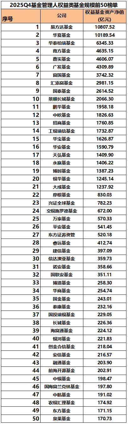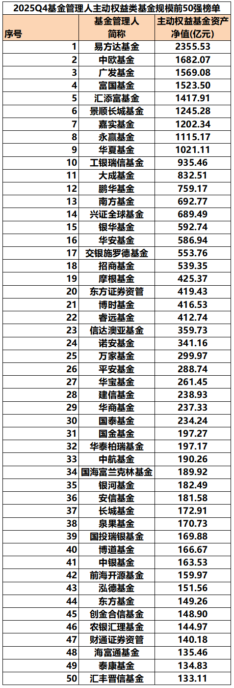去年第四季度基金公司主动权益基金规模增长最多的超200亿元 主动权益基金(含QDII)规模也是公募2025年四季报的重要看点之一。 截至去年第四季度末,易方达基金以2355.53亿元的规模位列主动权益基金规模榜单之首;中欧、广发、富国基金规模分列第二到第四位;汇添富、景顺长城、嘉实、永赢、华夏基金规模在1000亿元—1500亿元区间不等,占据排行榜第五到第九位;工银瑞信基金排名第十位。