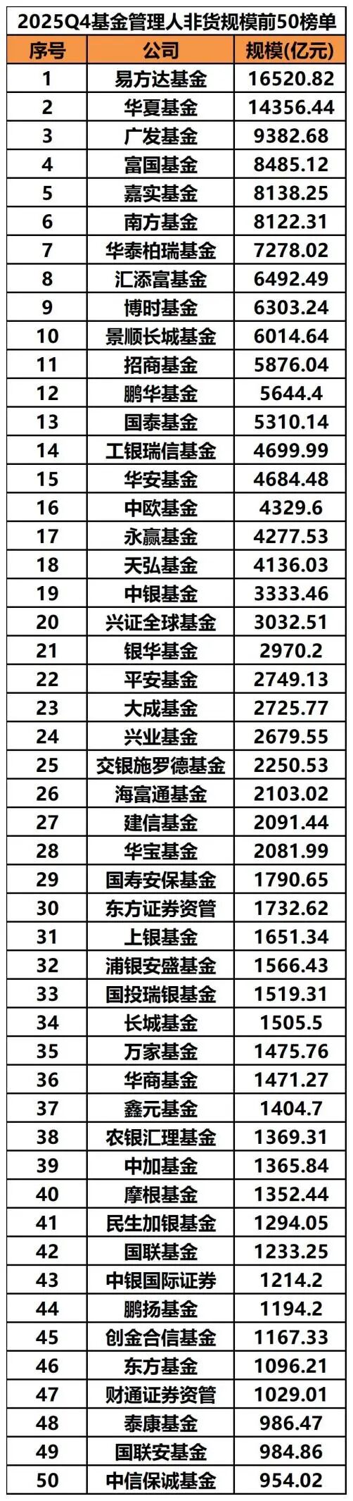 数据来源:银河证券 大中型基金公司非货币基金规模持续稳健增长 从非货币基金规模看,易方达基金非货币基金规模为1.65万亿元,位居全市场第一;华夏基金以1.44万亿元名列第二;广发基金以9382.68万亿元位居第三;富国基金以8485.12亿元位列第四;嘉实、南方基金以8138.25亿元、8122.31亿元紧随其后,分列第五、第六;华泰柏瑞超过7000亿元,位列第七;汇添富、博时、景顺长城基金也跻身前十。