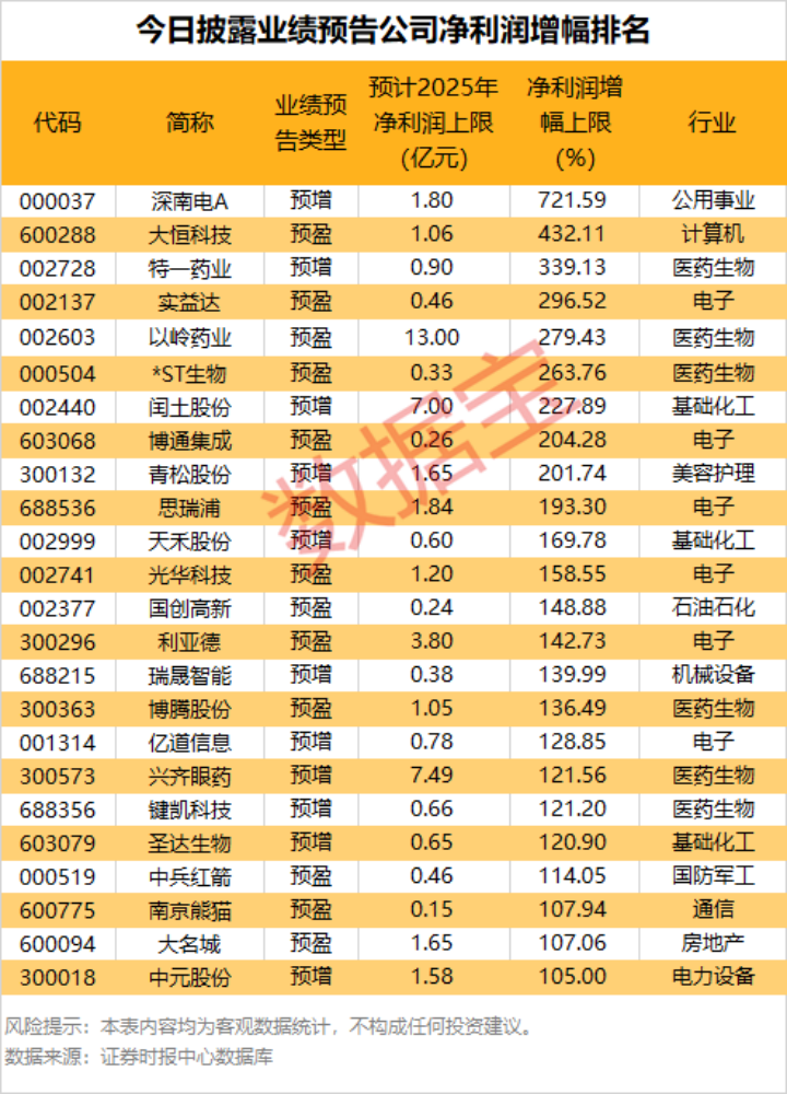 最新业绩大增股名单:24股净利润增幅超100% 业绩预告密集发布,今日共74家公司发布2025年度业绩预告,业绩预告类型来看,预增24家,预盈13家。以预计净利润增幅上限统计,共24家公司净利润增幅超100%。 今日公告业绩预亏的公司也有26家,按净利润最大亏损额统计,亚信安全、东风股份、云煤能源等15家公司净利润最大亏损超亿元。