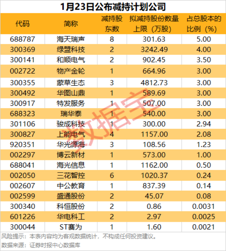 19家公司披露股东减持计划 1月23日,19家公司发布了股东减持计划,拟减持比例居前的有海天瑞声、绿盟科技、和顺电气等,拟减持比例分别为5%、4%、3.5%。