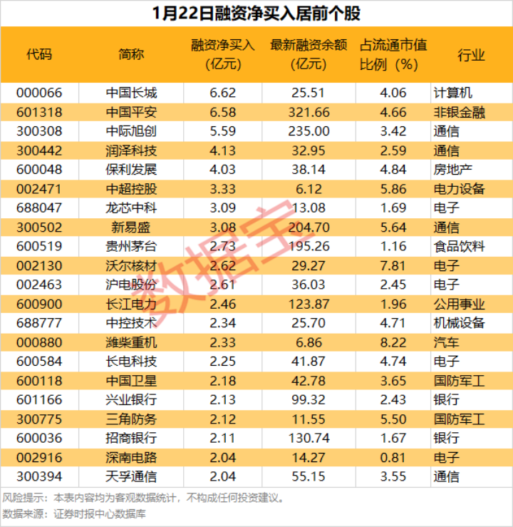 今日(1月23日)市场主要指数集体高开,电力设备、有色金属、国防军工板块涨幅居前。 截至10时43分,盘面上,医药商业板块走强,人民同泰、益丰药房涨停,大参林、鹭燕医药等多股均涨超5%。消息面上, 商务部等九部门发布关于促进药品零售行业高质量发展的意见,支持零售药店进行兼并重组。鼓励药品零售企业依法开展横向并购与重组。 太空光伏概念大幅拉升,明阳智能和太阳能等多股涨停。 贵金属板块再度走强,湖南白银和四川黄金等均涨超8%。现货黄金突破4900美元/盎司,续创历史新高。 新股速递:世盟股份今日申购 世盟股份今日申购,公司此次发行总数为2307.25万股,其中网上发行922.90万股,申购代码001220,申购价格28.00元 ,发行市盈率为15.29倍。 公司是根植华北、覆盖全国的领先综合物流企业,专注于为跨国制造企业提供定制化、一体化、嵌入式的供应链物流解决方案,客户覆盖汽车、包装品等多个制造业领域的领先企业,与包括北京奔驰、马士基、利乐包装、安姆科和发那科等各领域领先企业建立了紧密的合作关系。 8股融资净买入均超3亿元 截至1月22日,市场融资余额合计2.71万亿元,较前一交易日增加39.72亿元。 具体到个股,1月22日共有1756只股获融资净买入,净买入金额1亿元以上的有53只,其中,8只融资净买入额均超3亿元。中国长城融资净买入额居首,当日净买入6.62亿元,其次是中国平安、中际旭创,融资净买入金额分别为6.58亿元、5.59亿元,融资净买入金额居前的还有润泽科技、保利发展、中超控股等。 分行业统计,获融资客净买入超亿元个股中,电子、国防军工、电力设备等行业较为集中,分别有13只、6只、4只个股上榜。