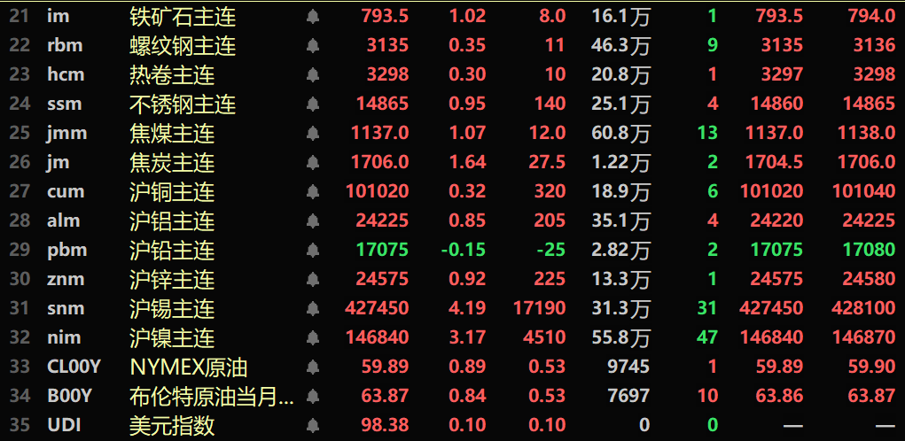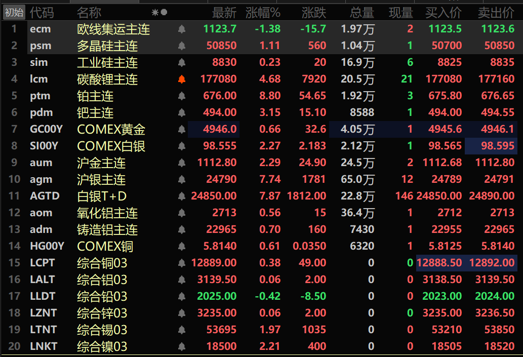 SMM1月23日讯: 金属市场方面: 截至午间收盘,内盘基本金属近全线上涨,沪铜涨0.32%。沪铝涨0.85%。沪铅跌0.15%,沪锌涨0.92%。沪锡涨4.19%。沪镍涨3.17%。 此外,铸造铝主连期货涨0.7%,氧化铝主连涨0.56%。碳酸锂主连延续前3个交易日的涨势继续涨4.68%。工业硅主连涨0.23%。多晶硅主连涨1.11%。 黑色系均飘红,铁矿涨1.02%,螺纹涨0.35%,热卷涨0.3%,不锈钢涨0.95%。双焦方面:焦煤主力合约涨1.07%,焦炭主力合约涨1.64%。 外盘基本金属方面,截至11:34分,LME金属多上行。伦铜涨0.38%。伦铝涨0.06%。伦铅跌0.42%。伦锌涨0.06%。伦锡涨1.97%。伦镍涨2.21%。 贵金属方面,截至11:34分,COMEX黄金涨0.66%,盘中刷新历史新高至4970美元/盎司;COMEX白银涨2.27%,盘中刷新历史新高至99.2美元/盎司。内盘贵金属方面:沪金主连涨2.29%,盘中刷新历史新高至1117.98元/克;沪银主连涨7.74%,盘中刷新历史新高至24950元/千克。 此外,截至午间收盘,铂主连期货涨8.8%,钯主连期货涨3.15%。 截至午间收盘,欧线集运主力合约跌1.38%,报1123.7点。 截至1月23日11:34分,部分期货午间行情: