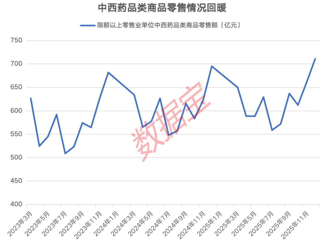 从消费情况来看,社零数据持续回暖。根据国家统计局公布的数据,2025年12月限额以上零售业单位中西药品类商品零售额达到710.7亿元,为2023年以来首次超过700亿元,同比增长1.2%,全年零售额7294亿元,同比增长1.8%。