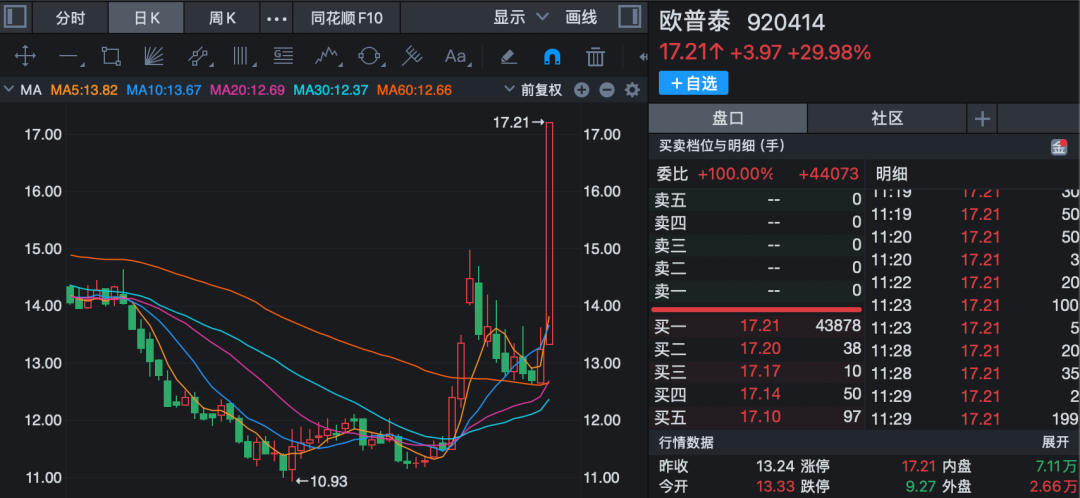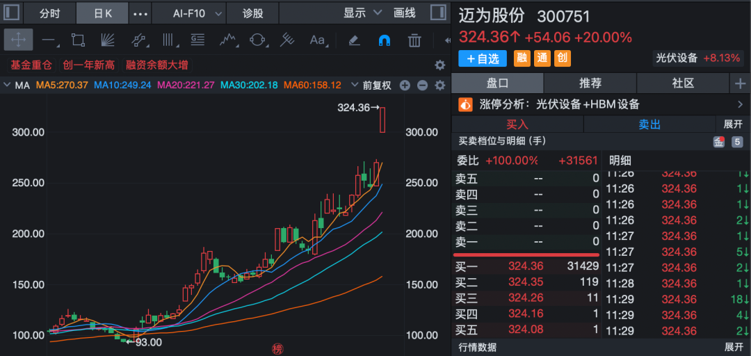 盘面上,新能源、国防军工、有色金属、专精特新等板块涨幅居前,消费电子、房地产、保险、煤炭等板块跌幅居前。 太空光伏概念获资金追捧 新能源产业全线走强,光伏领域最为活跃,光伏设备板块指数高开高走,盘中放量飙升近7%,半日成交超昨日全天成交。欧普泰(920414)开盘仅约2分钟垂直30%涨停,迈为股份也仅约5分钟20%涨停,连城数控、正泰电源等逾30股涨停或涨超10%。