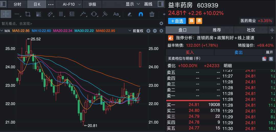 国金证券指出,太空光伏作为商业航天板块中的核心分支,其“价值量大、通胀趋势、高壁垒”的逻辑优势正逐步获得市场认可,再次重申“太空光伏将是2026年电新板块最强主线”,行情远未走完,建议积极参与。 医药商业迎政策利好 医药商业早间大幅高开高走,板块指数一度放量大涨逾4%,开盘不到1小时成交就超过昨日全天成交。益丰药房高开后秒速涨停,人民同泰也仅用约9分钟直线封板,大参林、润达医疗等涨幅居前。