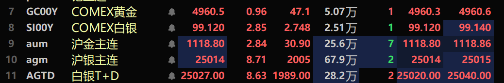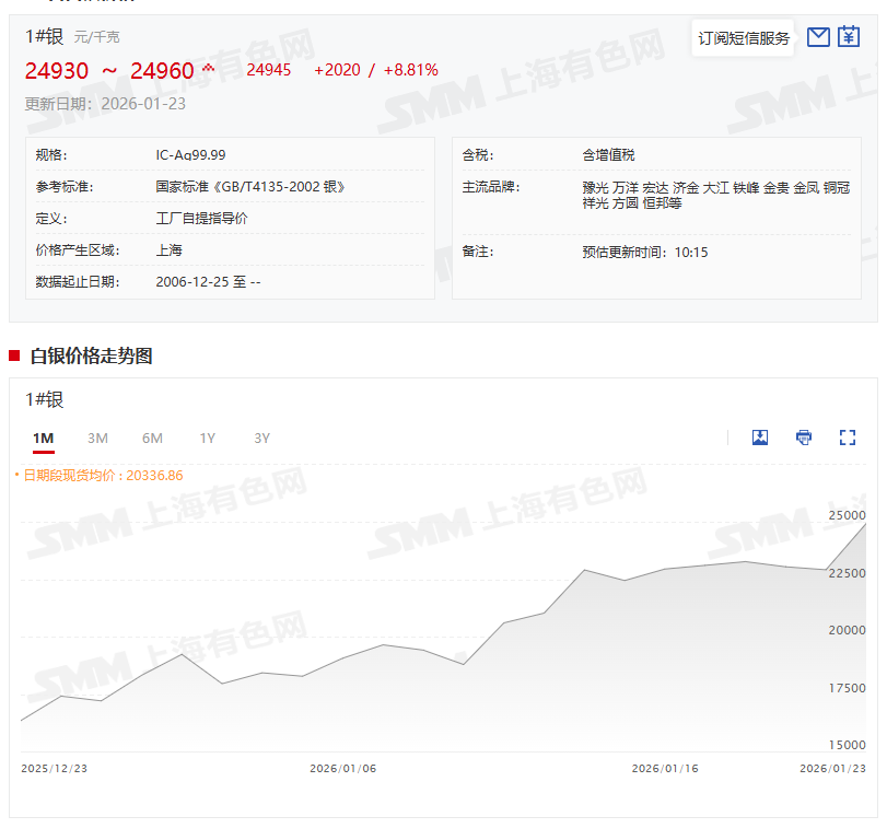 SMM1月23日讯: 据央视新闻报道,当地时间1月22日,美国总统特朗普在空军一号发表讲话时称,其政府正密切关注伊朗局势;针对对伊 “二级关税” 问题,特朗普明确表示,美国将对所有与伊朗开展贸易往来的国家加征 25% 关税,且该措施即将正式生效。伊朗相关地缘政治风险再度升温,市场避险情绪显著抬升,成为贵金属板块走强的重要支撑因素。宏观层面,美国10-11月消费者支出延续稳健增长态势,助力美国经济有望连续第三个季度保持强劲运行,但劳动力市场仍处于 “低招聘、低解雇” 的温和状态。受此影响,美元指数1月22日下行至两周多以来低点;市场对美联储货币政策的预期保持稳定,仍预计美联储将在 2026 年下半年实施两次 25 个基点的降息操作。同时,部分机构与央行层面的多重利好持续催化贵金属行情,高盛等主流投行大幅上调黄金目标价至 5400 美元 / 盎司,全球央行购金潮亦持续延续,中国央行已连续 14 个月增持黄金,波兰等国也相继公布黄金增持计划,为贵金属价格上行筑牢基本面支撑。价格走势方面,海内外贵金属均刷新历史新高,截至1月23日13:50分左右,COMEX黄金涨0.96%,盘中刷新历史新高至4970美元/盎司;沪金主连涨2.84%,盘中刷新历史新高至1119.12元/克;COMEX白银涨2.85%,盘中刷新历史新高至99.395美元/盎司;沪银主连涨8.71%,盘中刷新历史新高至25050元/千克;白银T+D涨8.63%,盘中刷新历史新高至25080元/千克。 股市方面,截至1月23日14:06分,贵金属板块以4.63%的涨幅领涨所有行业,个股方面:四川黄金、湖南白银涨超9%。恒邦股份、赤峰黄金以及中金黄金等涨幅居前。
