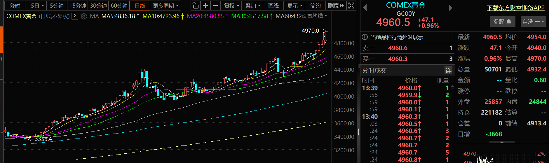 消息面 【美联储1月维持利率不变的概率为95%】据CME“美联储观察”:美联储1月降息25个基点的概率5%,维持利率不变的概率为95%。到3月累计降息25个基点的概率为15.4%,维持利率不变的概率为84.1%,累计降息50个基点的概率为0.6%。 【多家品牌金饰价一夜涨超50元】1月23日,黄金、白银价格继续刷新历史新高,现货黄金向上触及4960美元/盎司。与此同时,国内部分品牌金饰克价也有大幅上涨,创历史新高。周生生官网发布数据显示,足金饰品报1545元/克,较1月22日上涨超50元/克 。老凤祥上海会员中心小程序发布数据显示,足金饰品报1538元/克,较1月22日上涨超40元/克 。老庙黄金官网发布数据显示,足金饰品报1548元/克,较1月22日上涨超50元/克 。(财联社)》点击查看详情 【赤峰黄金:预计2025年净利30亿元-32亿元 同比增长70%-81%】赤峰黄金1月5日晚间披露2025年度业绩预告,预计2025年归母净利润30亿元至32亿元,同比增长70%-81%;扣非净利润预计29.7亿元至31.7亿元,同比增长75%-86%。 【中国黄金:2025年净利同比预降55%-65%】中国黄金日前公告称,中国黄金预计2025年归属于母公司所有者的净利润为2.86亿元-3.68亿元,同比减少55.00%到65.00%。扣除非经常性损益后的净利润为2.46亿元-3.28亿元,同比减少58.44%至68.80%。业绩下滑主要因黄金市场波动及新政影响,投资类与消费类黄金产品销售承压,门店客流下降,叠加金价上涨快于存货周转,导致公允价值变动损益对利润产生负向影响。 现货方面