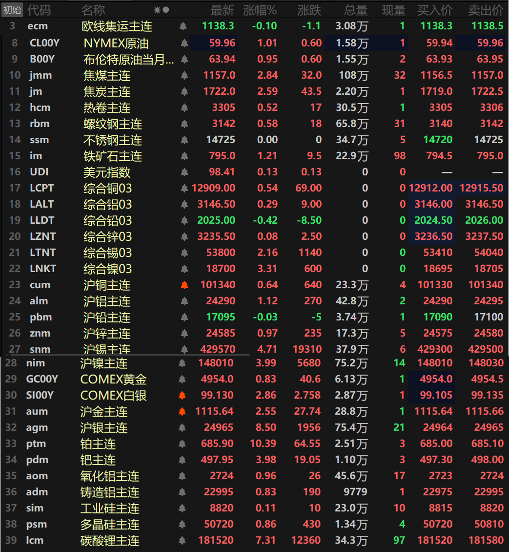 SMM 1月23日讯: 金属市场: 截至日间收盘,内盘基本金属普涨,仅沪铅唯一下跌,跌幅达0.03%。沪锡以4.71%的涨幅领涨,沪镍涨3.99%。沪铝涨1.12%,其余金属涨幅均在1%以内。氧化铝主连涨0.96%,铸造铝主连涨0.83%。 此外,碳酸锂主连涨7.31%,盘中一度冲至182000元/吨,刷新2023年9月以来的新高;多晶硅涨0.86%,工业硅涨0.11%。欧线集运主连跌0.1%报1138.3。 黑色系方面多飘红,不锈钢暂时收平于14725元/吨,铁矿涨1.21%,双焦方面,焦煤涨2.84%,焦炭涨2.59%。 外盘方面,截至15:05分,外盘基本金属除了伦铅外一同上涨,伦铅跌0.42%。伦锡涨2.16%,伦镍涨3.31%。其余金属涨幅均在1%以内。 贵金属方面,截至15:05分,COMEX黄金涨0.83%,盘中最高冲至4970美元/盎司,COMEX白银涨2.86%,盘中最高冲至99.395美元/盎司,同样续刷历史新高;国内方面,沪金涨2.55%,盘中最高触及1119.12元/克,沪银涨8.5%,盘中最高触及25050元/千克,一同刷新其上市以来的历史新高! 》金银续刷历史新高!纽金站上4900 沪银暴涨 金饰克价突破1500【SMM快讯】 此外,铂主连大涨10.39%,钯主连涨3.98%。 截至今日15:05分行情