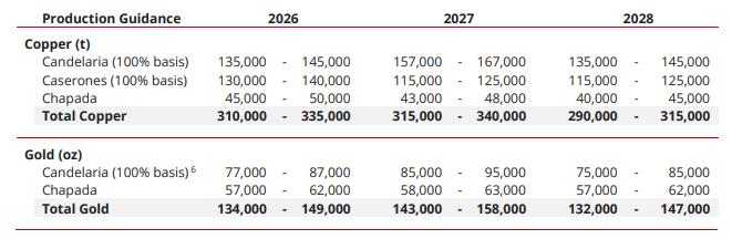 首席执行官Jack Lundin表示,该公司的短期和中期前景保持不变,预计矿山排序的变化将使2026年铜产量净增15,000吨,2027年增加约20,000吨。 同样位于智利的Candelaria铜矿在2025年生产了145,471吨铜。 Lundin预计,2026年铜的综合产量将为31万至33.5万吨,黄金产量将为13.4万至14.9万盎司,现金成本在每磅1.90美元至2.10美元之间。预计2027年铜产量将增至31.5万至34万吨,2028年将降至29万至31.5万吨。