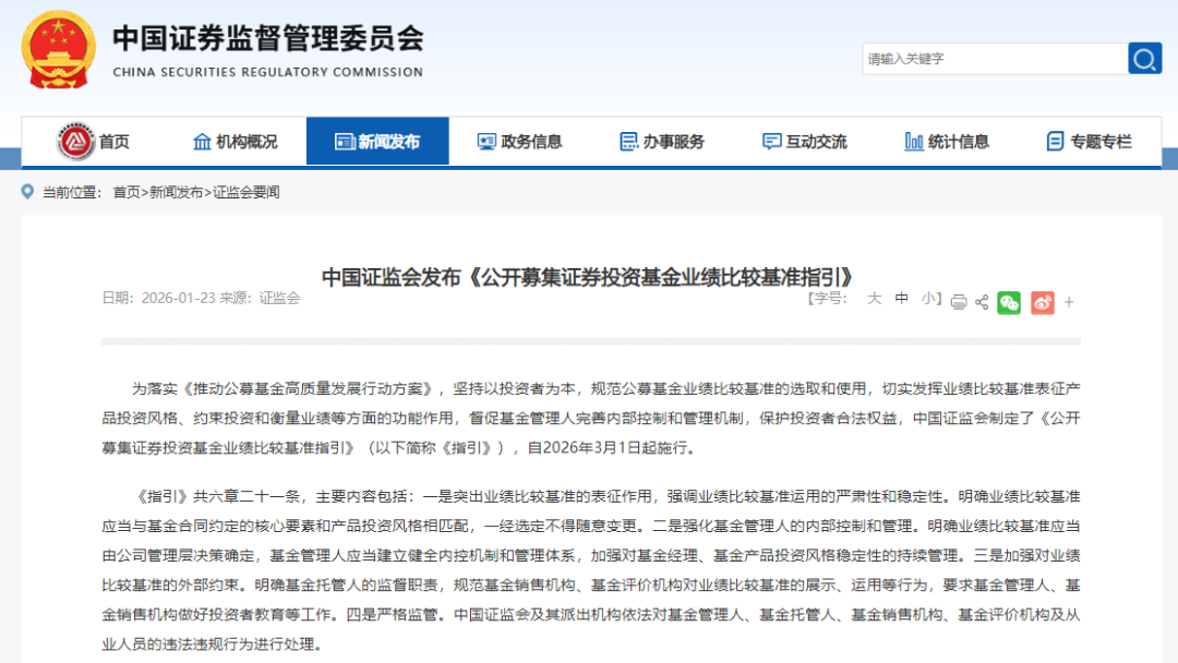 【导读】聚焦高质量发展,以投资之“锚”重塑行业生态 中国基金报记者 李树超 近日,中国证监会与中国基金业协会同步发布《公开募集证券投资基金业绩比较基准指引》(以下简称《指引》)及《公开募集证券投资基金业绩比较基准操作细则》(以下简称《操作细则》),直指“基准模糊”“风格漂移”“基金盲盒”等行业痛点。 受访业内机构表示,这场围绕业绩基准“锚”与“尺”的制度革新,是公募基金行业高质量发展进程中的重要里程碑,一场聚焦长期价值的行业生态重塑正式启幕。