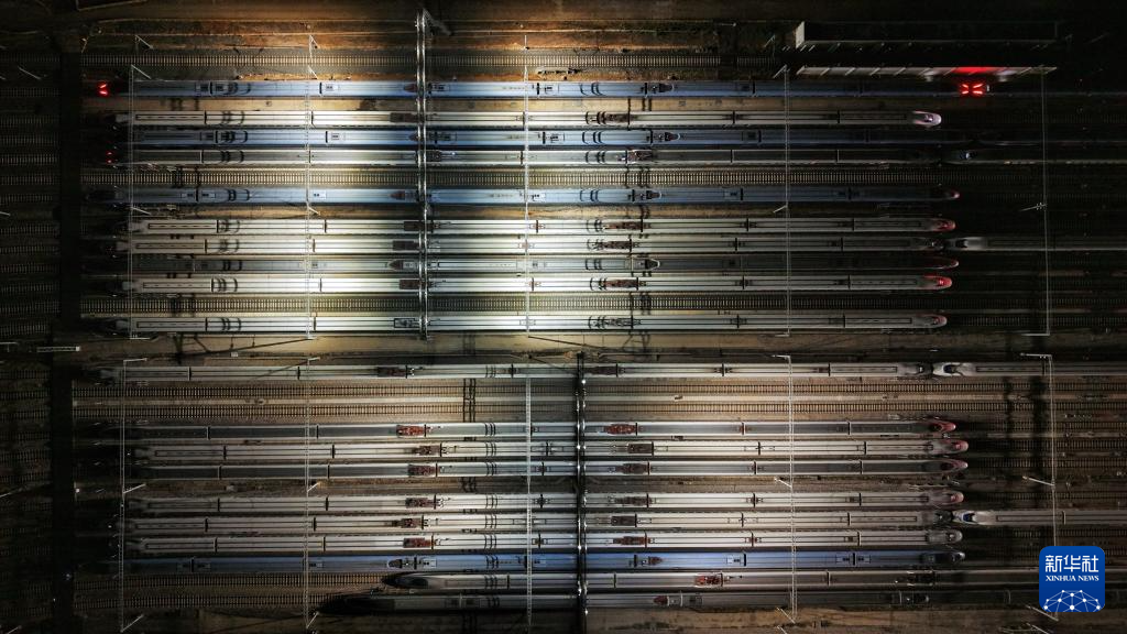 这是1月25日凌晨在昆明车辆段昆明南动车运用所拍摄的动车组列车(无人机照片)。 1月2