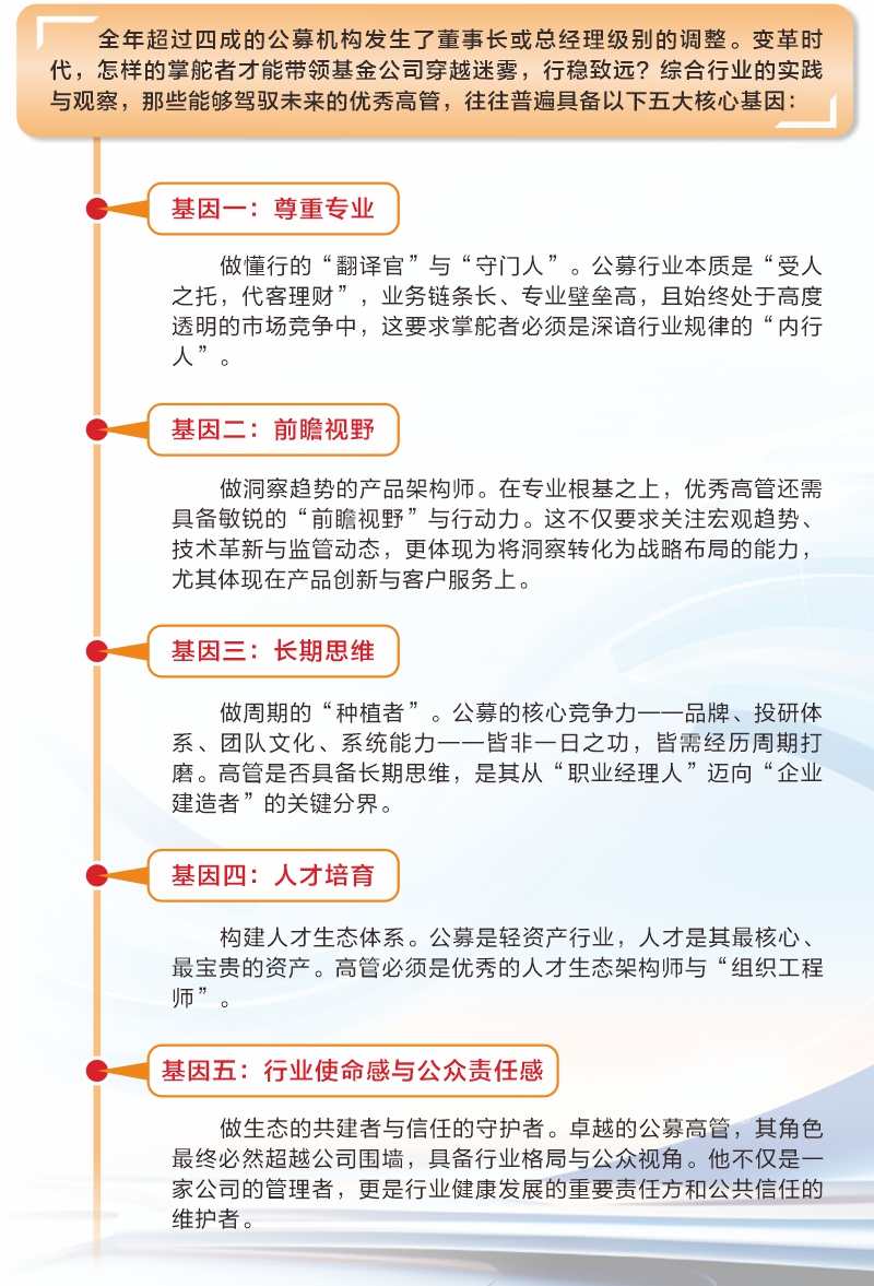 证券时报记者 陈书玉 2025年,公募基金行业迎来一场高管“换帅潮”。Wind数据显示,全年高级管理人员变更达462人次,涉及162家基金管理人,两项数据均创历史新高。董事长、总经理等核心职位变动频繁。 这场人事调整,既是行业自然的新老交替,也映射出公募基金从高速增长迈向高质量发展的深层转型。在费率改革、竞争加剧、投资者需求变迁等多重压力下,单纯规模扩张的逻辑已然失效。在这样的背景下,什么样的掌舵者能引领基金公司行稳致远?优秀的公募高管需要哪些核心基因? 2025年超四成公募机构“掌舵者”调整 2025年,公募行业管理层经历了一场范围广、频率高的“大洗牌”。数据显示,董事长变动116人次,覆盖55家基金公司;总经理变动94人次,涉及45家基金公司。全年超过四成的公募机构发生了董事长或总经理级别的调整,易方达基金、华夏基金、招商基金、博时基金等头部公司均完成核心管理层更迭。 变动的背后,是行业新老交替与战略转型的双重逻辑。一方面,公募行业始于1998年,早期从业的“60后”“70后”正陆续步入退休阶段,一批功勋人物荣退,标志着一个时代的落幕。另一方面,股东方战略调整也成为重要推手,许多新任高管由股东委派,以强化协同;部分中小公司的变动则与业绩考核压力相关。 新一轮“换帅”并非简单人事轮替,而是行业进化方向的缩影。在费率改革与竞争加剧的背景下,新上任的掌舵者普遍将战略重点从“重量”转向“重质”,推动投研、产品与服务的深度改革。这场自上而下的管理层更迭,不仅关乎单家公司未来,更将影响公募行业的高质量发展路径。 优秀公募高管的五大基因 在2025年这场史无前例的“换帅潮”中,行业在探寻一个核心问题的答案:变革时代,怎样的掌舵者才能带领基金公司穿越迷雾,行稳致远?综合行业的实践与观察,那些能够驾驭未来的优秀高管,往往具备以下五大核心基因。 基因一:尊重专业——做懂行的“翻译官”与“守门人”。公募行业本质是“受人之托,代客理财”,业务链条长、专业壁垒高,且始终处于高度透明的市场竞争中,这要求掌舵者必须是深谙行业规律的“内行人”。 专业性体现在两方面:要么自身长期浸润行业,对投研、产品、风控、渠道等有深刻体感与前瞻认知;要么虽出身其他领域,却怀有敬畏之心与空杯心态,愿意投入时间系统学习,真正读懂行业逻辑。正如一位资深高管所言:“在复杂多变的资本市场,价值创造极度依赖专业能力。” 专业的高管,首先是“专业的守护者与践行者”。在产品布局上,他能辨别哪些是符合长期趋势的战略性产品,而非盲目追逐热点;在投资决策中,他尊重投研委员会的独立判断,恪守职责边界。行业共识是:“在公司里,专业意见应重于领导意见。”但落实这一共识,需管理层给予专业团队充分的施展空间与尊重。 更进一步,专业高管还需扮演股东意志与专业经营之间的“翻译官”与“平衡者”。股东关注财务回报,而公募行业的利润具有周期性,短期规模增长往往隐含长期风险。一位高管指出:“唯有立足长远,才能避免急功近利的经营行为。”因此,高管的重要职责是以股东能理解的语言,清晰传达行业特质,解释为何需在市场低潮期坚持投入、为何应克制规模冲动。 基因二:前瞻视野——做洞察趋势的产品架构师。在专业根基之上,优秀高管还需具备敏锐的“前瞻视野”与行动力。这不仅要求关注宏观趋势、技术革新与监管动态,更体现为将洞察转化为战略布局的能力,尤其体现在产品创新与客户服务上。 当前资管行业的竞争,正从资金募集转向资产获取与定价。谁能更早识别结构性机会,并通过清晰、高效的产品形态予以表达,谁就能抢占先机。这意味着高管不能局限于内部管理,必须持续追踪市场前沿。 前瞻能力的核心,在于精准把握客户需求变化,并以此引导产品布局。近年来,具备深厚市场背景的公募掌舵者,因更懂渠道与客户,往往在多品类与创新产品上表现更佳;而投研出身的领导者,则需加深对负债端的理解,将投资能力转化为客户所需的解决方案。 在行业“马太效应”加剧的背景下,部分公司能实现突围,关键在于强大的“产品力”。这源于管理层对市场空白的敏锐捕捉与前瞻性卡位,通过填补短板抓住结构性机遇。因此,与时俱进意味着从“产品中心”转向“客户中心”,凭借精准的产品架构,在红海中开辟差异化的蓝海。 基因三:长期思维——做周期的“种植者”。公募的核心竞争力——品牌、投研体系、团队文化、系统能力——皆非一日之功,皆需经历周期打磨。高管是否具备长期思维,是其从“职业经理人”迈向“企业建造者”的关键分界。 长期思维首先体现在对市场周期的深刻理解与战略定力。资产管理行业中,任何资产类别或策略皆有起伏。优秀高管不会在牛市顶峰被规模冲昏头脑,反而主动预警风险、节制发行;在熊市或策略低谷期,则能顶住压力,坚持投入人才、系统与新品研发。这份定力,既是对规律的尊重,也是对持有人的真正负责。 然而,长期思维常面临现实挑战:高管自身的任期预期。若领导者视自己为“过渡者”或“短期绩效达成者”,决策便容易偏向任期内能见效的“速成”项目,而回避那些需长期投入的战略性工程,如核心系统建设或新生代基金经理培养。 对此,一位公募总经理曾言:“总经理虽有