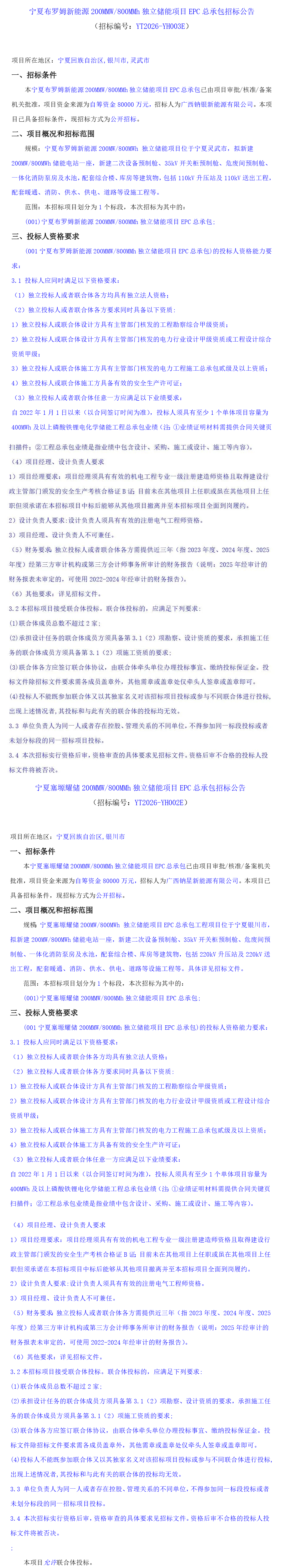 北极星储能网讯:1月23日,宁夏两大独立储能项目EPC招标,总容量为400MW/1600MWh,项目资金分别8亿元,相当于单价1元/Wh,两项目均允许联合体投标。 其中宁夏布罗姆新能源200MMW/800MMh独立储能项目,位于宁夏灵武市,招标人为广西钠银新能源有限公司。 宁夏塞塬耀储 200MMW/800MMh独立储能项目,位于宁夏银川市,招标人为广西钠星新能源有限公司。 两个项目招标人均为湖南镕锂新能源科技有限公司旗下控股公司。资料显示,镕锂新能源成立于2020年7月28日,总部位于湖南长沙市宁乡市,是一家专业从事锂离子电池负极材料研发、生产、销售一体的企业。 原文如下:
