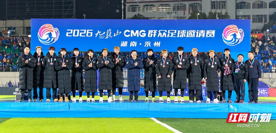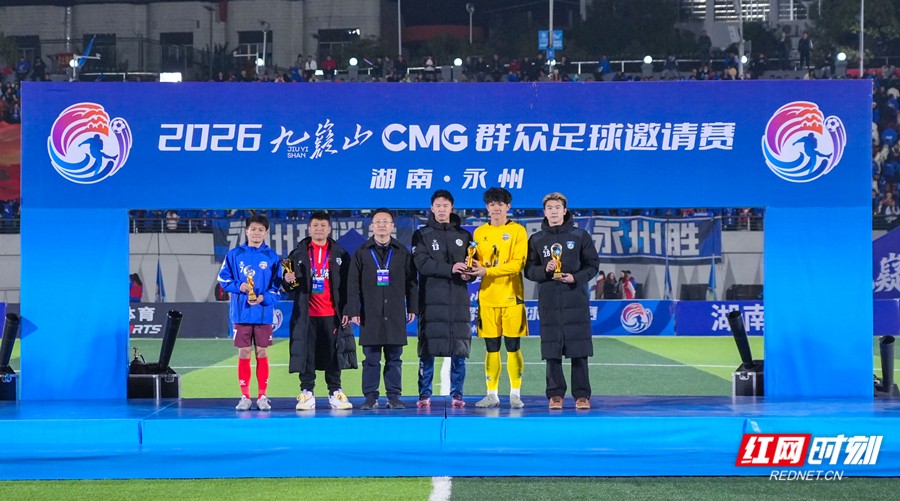红网时刻新闻1月25日讯(永州融媒记者 陈小波 袁志圣 文佳星)1月24日晚,2026九嶷山CMG群众足球邀请赛决赛在永州市体育场举行。经过90分钟的鏖战,最终广东湛江队以2∶1战胜湖南永州队,夺得CMG群众足球邀请赛冠军,湖南永州队获得亚军,山东泰安队获得季军。湖南省政协副主席、民盟省委会主委何寄华,中央广播电视总台体育青少节目中心党委书记吕逸涛,市委书记朱洪武,市委副书记、市长陈爱林,中央广播电视总台湖南总站站长朱兴建等观看比赛并颁奖。 2026九嶷山CMG群众足球邀请赛共有六支队伍参赛,分为A、B两个小组,A组的永州队与泰安队同以1胜1平积4分,但永州队凭借公平竞赛积分获得小组第一,B 组的湛江队以两战全胜的战绩斩获小组头名,小组第一的永州队与湛江队会师决赛。