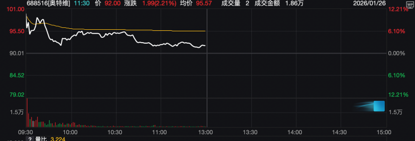 此外,煤炭、非银金融、银行等板块亦涨幅居前;国防军工、传媒、计算机等前期强势板块今天上午则回调。 多只强势股今天上午走势分化 多只A股市场的强势股走势分化。 奥特维今天上午继续上行,盘中涨幅超过12%,后涨幅有所收窄。2026年以来,公司股价涨幅已经超过100%。