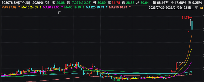 金安国纪昨晚发布公告称,截至公告披露日,公司本次向特定对象发行股票事项正在推进中,该事项尚需经深圳证券交易所审核通过并经中国证券监督管理委员会同意注册后方可正式实施,能否得以实施及具体的实施时间尚存在不确定性。公司将严格遵守相关法律、行政法规及规范性文件的规定,根据该事项进展情况及时履行信息披露义务。除上述事项外,公司、控股股东、实际控制人不存在其他关于公司的应披露而未披露的重大事项。 江化微今天上午则大跌7.27%,此前该股曾经连续5个交易日涨停。
