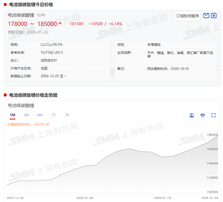 》点击查看SMM新能源产品现货报价 期货价格方面,自1月20日以来,碳酸锂期货价格在经历此前的四连跌后重拾涨势,期货价格在贵金属持续飙升、有色金属普涨的氛围下接连上探,在1月23日上周五盘中更是一度突破18万元/吨的整数关口,1月26日早间,碳酸锂期货继续高开,盘中一度,盘中最高一度攀升至189440元/吨的高位,刷新其2023年9月以来的新高。但随后碳酸锂期货涨幅快速回落,截至日间收盘,碳酸锂主连以6.56%的跌幅报165680元/吨,较1月19日收盘价147260元/吨上涨18420元/吨,涨幅达12.51%。