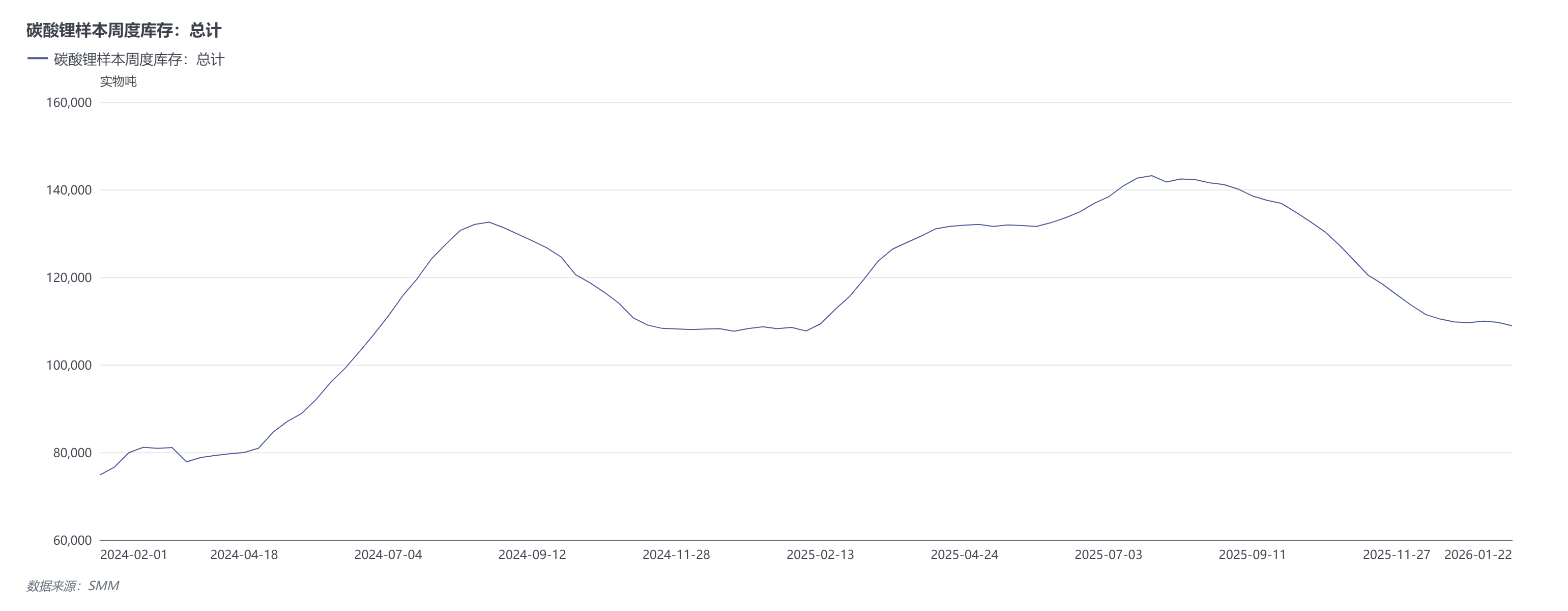 对于近期碳酸锂期现价格持续上涨的原因,SMM认为,主要是受最近有色金属普涨的氛围、资金的青睐以及碳酸锂表现较好的基本面带动。 宏观面上,近期,美国总统特朗普动作频繁,美国对格陵兰岛的野心以及美国政府向美联储施压引发市场避险情绪升温,贵金属集体飙涨。同时,美元指数接连下探,市场对美联储货币政策的预期保持稳定,仍预计美联储将在 2026年下半年实施两次25个基点的降息操作。在以上种种背景下,有色金属整体维持强势,偏好的宏观氛围也对近期碳酸锂期货价格上涨带来了一定的动力。 碳酸锂基本面上,据SMM了解,当前碳酸锂基本面整体呈现供应偏紧的态势,临近春节,供应端部分锂盐厂开始安排检修计划,预计后续碳酸锂产量或迎来一定的缩减,而同时,下游需求端出现节前备库的情况,下游材料厂在按需采购的基础上,开始为二月份的生产进行备货,对现货需求形成一定支撑。 此外,之前财政部、国家税务总局联合发布的《关于调整光伏等产品出口退税政策的公告》中提到,自2026年4月1日起,电池产品增值税出口退税率将从现行的9%下调至6%,自2027年1月1日起,电池产品出口退税将彻底取消。目前市场普遍认为,出口退税取消有望令下游电池厂在一季度出现“淡季不淡”的抢出口情况,因此SMM预计短期内碳酸锂现货市场仍旧呈现供不应求的状态。 据SMM碳酸锂样本周度库存数据显示, 自1月8日以来碳酸锂样本周度库存呈现持续去库态势,截至1月22日,其周度库存降至108896实物吨。