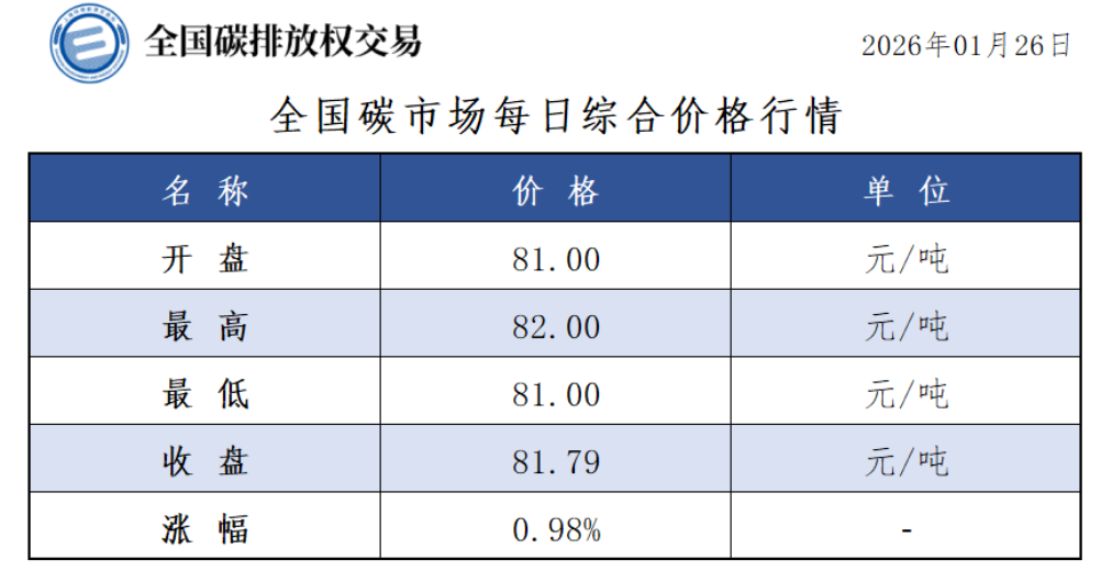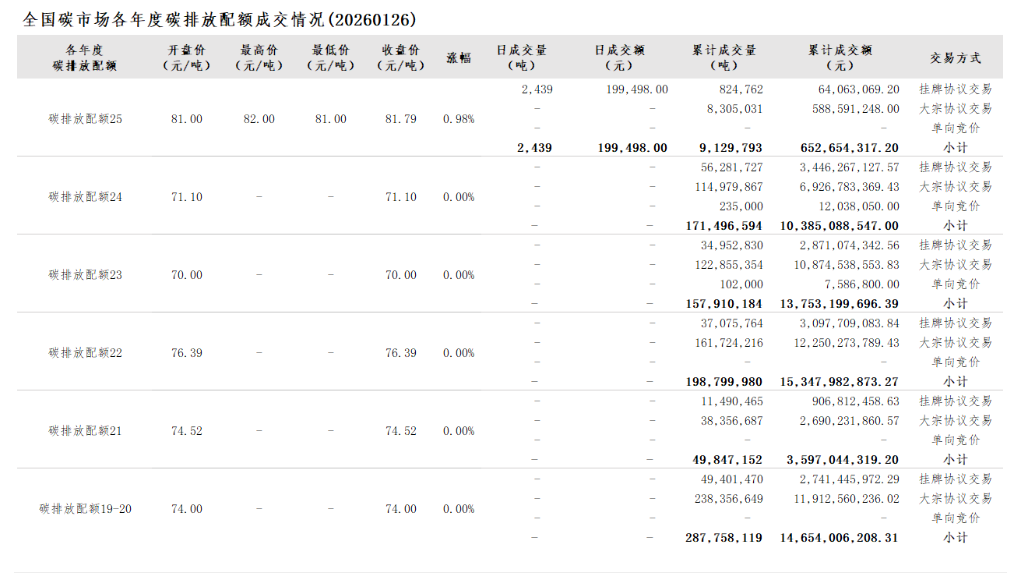 1月26日讯: 今日全国碳市场综合价格行情为: 开盘价81.00元/吨,最高价82.00元/吨,最低价81.00元/吨,收盘价81.79元/吨,收盘价较前一日上涨0.98%。 今日挂牌协议交易成交量2,439吨,成交额199,498.00元;今日无大宗协议交易;今日无单向竞价。 今日全国碳排放配额总成交量2,439吨,总成交额199,498.00元。 2026年1月1日至1月26日,全国碳市场碳排放配额成交量10,075,302吨,成交额727,357,729.80元。 截至2026年1月26日,全国碳市场碳排放配额累计成交量874,941,822吨,累计成交额58,389,975,961.37元。