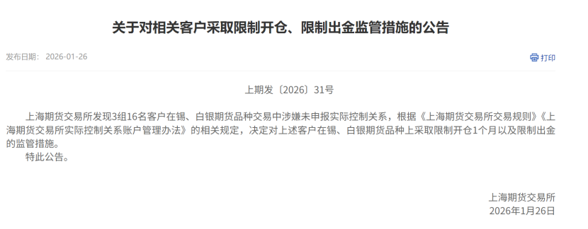1月26日,上海期货交易所发布通知,调整白银、锡期货相关合约交易限额。 根