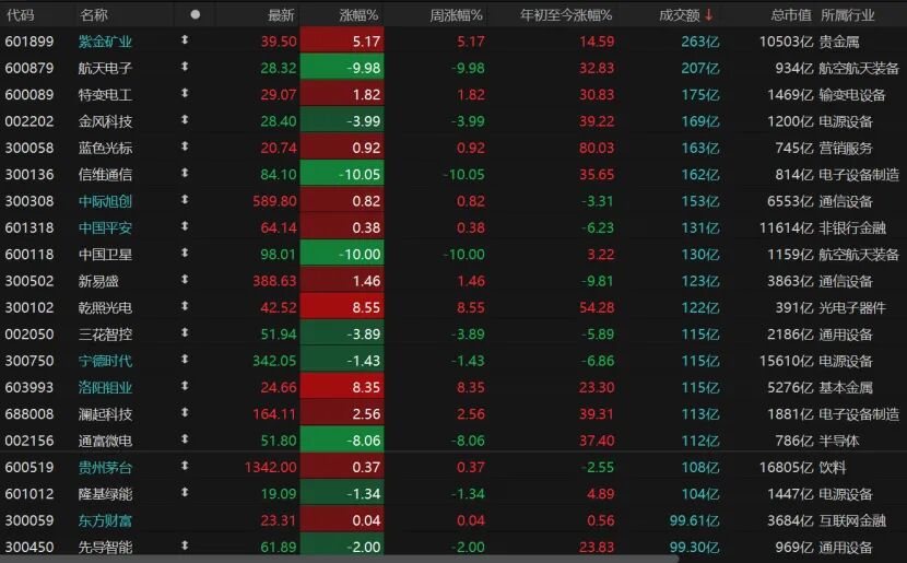 市场亏钱效应明显,3771只个股收跌,跌停股40只;1604只个股收涨,涨停股77只。今日18只个股日成交额超过100亿元,航天电子、中国卫星等航空航天装备个股,信维通信等电子设备制造个股,通富微电等半导体个股,金风科技等电源设备个股大跌。但贵金属个股紫金矿业、基本金属个股洛阳钼业、光电子器件个股乾照光电大涨。