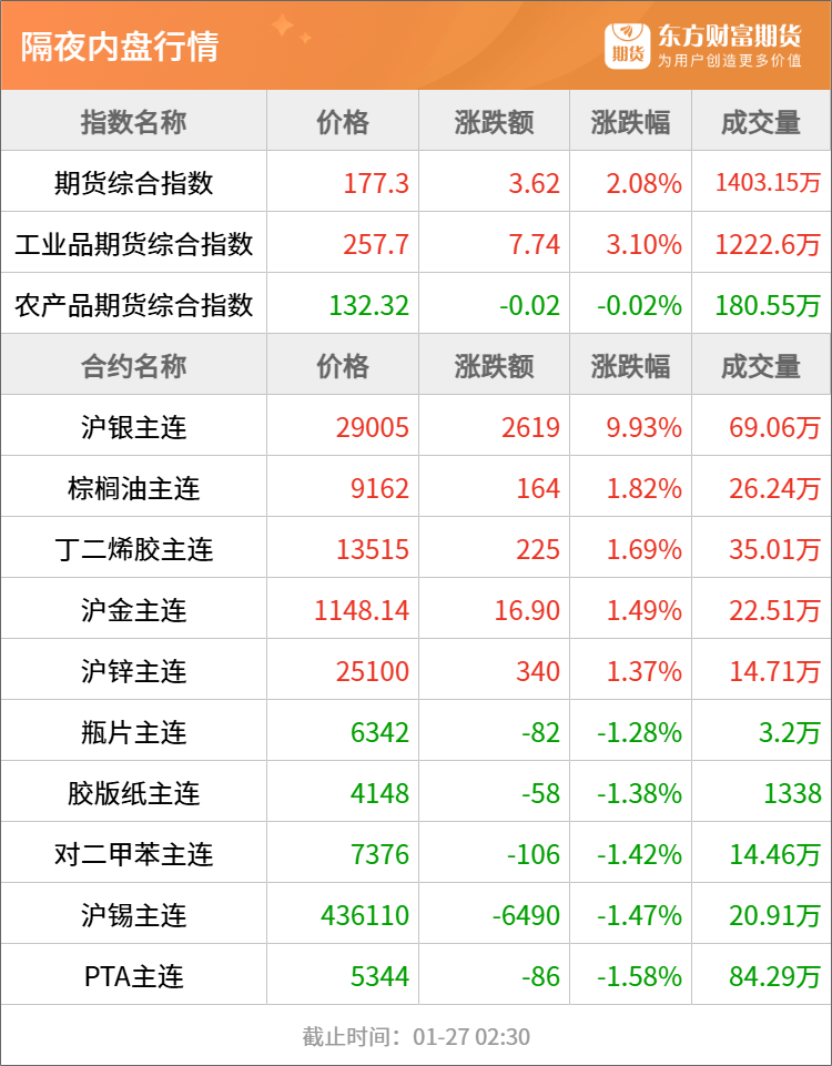 隔夜行情![]() ![]() 每日精选交易所大幅收紧白银期货交易限额 碳酸锂期货冲高回落 产业企业:等到心仪价格再加大采购力度 特朗普称提高对韩国多种商品关税税率至25% 宏观产经央视新闻:1月26日,国新办就2025年商务工作及运行情况举行新闻发布会。发布会上介绍,2026年商务部将深入实施提振消费专项行动,围绕出政策、办活动、优场景三个方面开展工作。 央行网站:2026年1月22日,中国人民银行召开2026年宏观审慎工作会议。会议要求,2026年宏观审慎工作要继续按照构建覆盖全面的宏观审慎管理体系部署,强化中央银行宏观审慎管理功能,持续完善宏观审慎和金融稳定委员会工作机制,逐步拓展宏观审慎政策覆盖范围,前瞻性研判系统性金融风险隐患,创新丰富政策工具箱,维护金融市场稳健运行和金融体系整体稳定。以服务构建新发展格局为导向,进一步完善人民币跨境使用政策,促进货物贸易便利化,优化人民币清算行布局,更好发挥货币互换作用,发展人民币离岸市场,支持上海国际金融中心建设,更好满足各类主体人民币交易结算、投融资、风险管理等需求。 上海证券报:中国人民银行副行长邹澜1月26日在第19届亚洲金融论坛上表示,下一步,中国人民银行将坚定支持并继续稳步推进香港离岸人民币市场建设。增加人民币业务资金安排规模,为香港离岸市场提供更加充裕的流动性支持。为更好满足市场需求,中国人民银行支持香港金管局将人民币业务资金安排规模由1000亿元增加至2000亿元。同时支持香港人民币清算行通过发行同业存单、账户融资等多种方式,从境内市场获取不同期限人民币流动性,多措并举提升香港离岸人民币流动性水平。 品种资讯黑色系期货 焦炭:1月26日,焦炭价格暂稳运行。产地焦企库存低位运行,焦炭供应有收紧态势。另外,原料端炼焦煤价格虽有回调,但大多数煤种仍在高位,焦企利润亏损压力不减,焦炭现货成本支撑较强。临近年关,钢厂冬储补库需求温和释放。综合支撑下,本轮焦炭本周有较大落地概率,预计焦炭价格稳中偏强运行。(Mysteel) 铁矿石:2026年01月19日-01月25日中国47港铁矿石到港总量2625.5万吨,环比减少272.2万吨;中国45港铁矿石到港总量2530.0万吨,环比减少129.7万吨;北方六港铁矿石到港总量1238.1万吨,环比减少204.8万吨。(Mysteel) 2026年1月19日-1月25日全球铁矿石发运总量2978.3万吨,环比增加48.5万吨。澳洲巴西铁矿发运总量2394.3万吨,环比增加147.6万吨。澳洲发运量1837.4万吨,环比增加149.3万吨,其中澳洲发往中国的量1487.6万吨,环比增加97.8万吨。巴西发运量556.8万吨,环比减少1.8万吨。(Mysteel) 钢材:2026年1月中旬,重点统计钢铁企业共生产粗钢1979万吨,平均日产197.9万吨,日产环比下降0.9%;生铁1794万吨,平均日产179.4万吨,日产环比增长1.8%;钢材1877万吨,平均日产187.7万吨,日产环比增长3.0%。据此估算,本旬全国日产粗钢244万吨、环比下降1.7%,日产生铁216万吨、环比增长0.6%,日产钢材393万吨、环比增长1.5%。(中钢协) 2026年1月中旬,重点统计钢铁企业钢材库存量1613万吨,环比上一旬增加109万吨,增长7.3%;比年初增加199万吨,增长14.1%;比上月同旬增加12万吨,增长0.8%;比去年同旬增加320万吨,增长24.7%,比前年同旬增加78万吨,增长5.1%。(中钢协) 不锈钢:据SMM了解,继上周五封盘后,印尼某主流不锈钢厂于今早(1月26日)恢复报价,并直接上调30美元/吨。这是该厂在周一开市后做出的最新价格调整。(SMM) 农产品期货 豆粕、玉米:为更好满足实体企业精细化管理短期风险的需求,大连商品交易所将于2026年2月2日交易时(即1月30日晚夜盘)起,挂牌豆粕、玉米系列期权合约。(大商所) 豆油:2026年1月,Mysteel农产品对样本点进行了优化,增加内陆地区豆油库存,共计114家企业库存,原先库存数据为90家沿海油厂样本数据。114家样本调研显示,截至2026年1月23日,全国豆油商业库存116.2万吨,环比上周增加0.19万吨,增幅0.16%。同比增加12.65万吨,增幅12.22%。(Mysteel) 棕榈油:截至2026年1月23日(第4周),全国重点地区棕榈油商业库存74.23万吨,环比上周减少0.38万吨,减幅0.51%;同比去年46.85万吨增加27.38万吨,增幅58.44%。(Mysteel) 据马来西亚棕榈油协会(MPOA)发布的数据,马来西亚1月1-20日棕榈油产量预估减少14.43%,其中马来半岛减少14.29%,沙巴减少11.12%,沙捞越减少23.21%,婆罗洲减少14.6%。(新华财经) 有色/贵金属期货 沪银、沪锡:上期所调整白银、锡期货相关合约交易限额。白银期货AG2602、AG2603、AG2604、AG2605、AG2606、AG2607、AG2608、AG2609、AG2610、AG2611、AG2612、AG2701合约的日内开仓交易的最大数量为800手。锡期货SN2602、SN2603、SN2604、SN2605、SN2606、SN2607、SN2608、SN2609、SN2610、SN2611、SN2612、SN2701合约的日内开仓交易的最大数量为200手。 实际控制关系账户组日内开仓交易的最大数量按照单个客户执行。套期保值交易和做市交易的开仓数量不受此限制。(上期所网站) 上海期货交易所发现3组16名客户在锡、白银期货品种交易中涉嫌未申报实际控制关系,根据《上海期货交易所交易规则》《上海期货交易所实际控制关系账户管理办法》的相关规定,决定对上述客户在锡、白银期货品种上采取限制开仓1个月以及限制出金的监管措施。(上期所) 沪铜、沪铝:上期所调整铜等期货相关合约涨跌停板幅度和交易保证金比例。铜期货已上市合约的涨跌停板幅度调整为9%,套保持仓交易保证金比例调整为10%,一