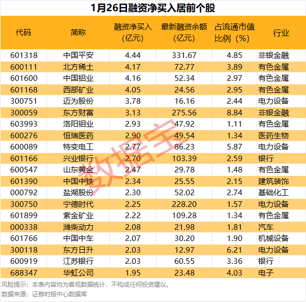 6股融资净买入超3亿元 截至1月26日,市场融资余额合计2.71万亿元,较前一交易日增加18.81亿元。 分行业统计,有17个行业融资余额增加,有色金属行业融资余额增加最多,较上一日增加32.35亿元;融资余额增加居前的行业还有电力设备、医药生物、基础化工等,融资余额分别增加24.33亿元、10.55亿元、8.36亿元;融资余额减少的行业有14个,电子、国防军工、通信等行业融资余额减少较多,分别减少23.72亿元、18.14亿元、9.20亿元。 具体到个股,1月26日获融资净买入1亿元以上的有53只,其中,6只股融资净买入额超3亿元。中国平安融资净买入额居首,当日净买入4.44亿元,其次是北方稀土、中国铝业,融资净买入金额分别为4.17亿元、4.16亿元,融资净买入金额居前的还有西部矿业、迈为股份、东方财富等。