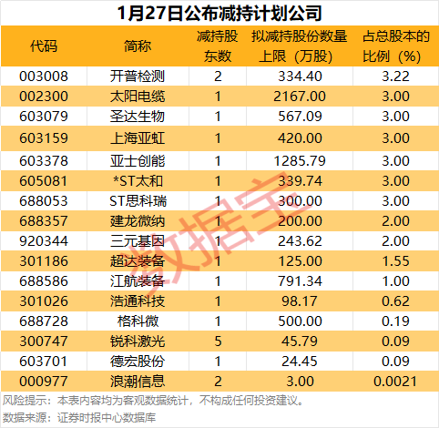 16家公司最新披露减持计划 今日共16家公司公告股东减持计划,拟减持比例居前的有开普检测、太阳电缆、圣达生物等。