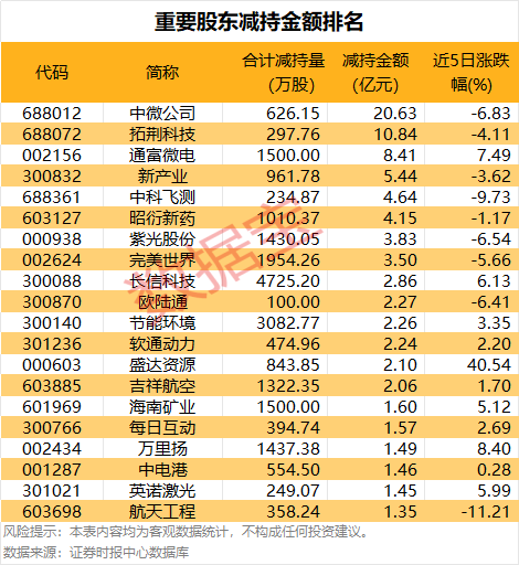 重要股东大手笔减持股 近期发布相关减持公告公司中,若以股权变动截止日为基准进行统计,近5个交易日(1月20日~26日)共有136家公司股份遭重要股东减持,累计减持量达6.15亿股,减持金额合计130.68亿元。 从金额看,减持金额在1亿元以上的有30家,减持金额最多的是中微公司,其间累计减持626.15万股,减持金额合计20.63亿元;其次是拓荆科技,减持量为297.76万股,减持金额10.84亿元;通富微电近5日遭股东减持8.41亿元,位居股东减持榜第三位。