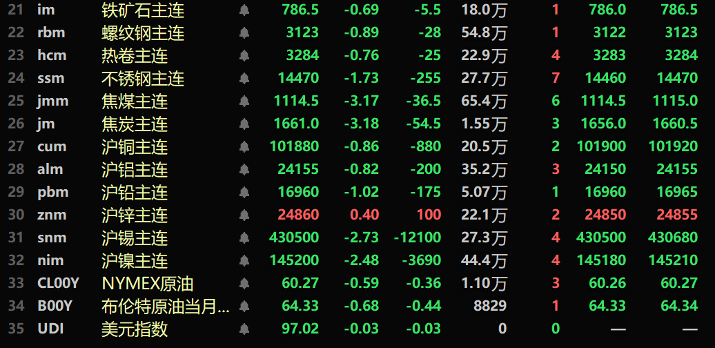 SMM1月27日讯: 金属市场方面: 截至午间收盘,内盘基本金属近全线下跌,沪铜跌0.86%。沪铝跌0.82%。沪铅跌1.02%,沪锌涨0.4%。沪锡跌2.73%,沪镍跌2.48%。 此外,铸造铝主连期货跌0.61%,氧化铝主连跌0.11%。碳酸锂主连跌2.69%。工业硅主连跌0.73%。多晶硅主连跌0.07%。 黑色系均飘绿,铁矿跌0.69%,螺纹跌0.89%,热卷跌0.76%,不锈钢跌1.73%。双焦方面:焦煤主力合约跌3.17%,焦炭主力合约跌3.18%。 外盘基本金属方面,截至11:39分,LME金属全线下跌。伦铜跌1.03%。伦铝跌0.97%。伦铅跌0.61%。伦锌跌0.88%。伦锡跌1.05%。伦镍跌1.1%。 贵金属方面,截至11:39分,COMEX黄金跌0.48%;COMEX白银跌5.57%。内盘贵金属方面:沪金主连涨0.92%,盘中刷新历史新高至1154.46元/克;沪银主连涨6.26%,盘中刷新历史新高至30020元/千克。 此外,截至午间收盘,铂主连期货跌6.96%,钯主连期货跌4.51%。 截至午间收盘,欧线集运主力合约跌2.13%,报1169.7点。 截至1月27日11:39分,部分期货午间行情: