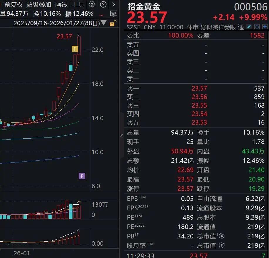 贵金属概念股爆发,其中招金黄金(000506)拉升涨停,近7个交易日5度涨停。 1月27日早盘,A股探底回升,大盘蓝筹股继续领涨,上证50盘中一度涨逾1%,上证指数在4100点附近获得支撑后逐步反弹并翻红,沪深300、科创50等也小幅飘红,深证成指、北证50等则小幅飘绿。近4500只个股下跌,成交呈萎缩趋势。