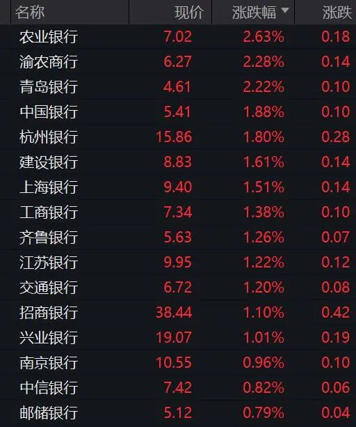 港股保险股也强势上攻,恒生保险主题指数大涨逾2%,逼近历史最高点。友邦保险、中国人寿、中国人民保险集团、新华保险等涨幅居前。 根据公募基金年报统计,2025年四季度,保险板块配置比例从1.03%升至2.13%,但总体仍欠配0.33%。中国平安、中国太保获超配,其中中国平安持仓市值比例从0.68%提高至1.449%,中国太保持仓市值比例从0.22%提高至0.422%。 国金证券指出,健康险“新五年规划”出台,专业化经营、高质量发展导向明显。政策定调健康险产品发展趋势,预计未来医疗险、长护险、失能险是增长的主要驱动力。 AH银行股早间也联袂走强,A股银行板块指数高开高走涨逾1%,农业银行、渝农商行、青岛银行、中国银行等涨幅居前。 港股方面,恒生金融分类指数大涨逾2%,创历史新高。东亚银行、泸州银行、农业银行、中银香港等涨幅居前。 银河证券认为,银行板块当前持仓结构显示,被动型基金与北上资金均小幅加仓,其中股份行持仓占比提升显著。高股息与低估值特性在低利率环境下对长线资金吸引力增强,推动估值定价重构。银行板块在低利率与中长期资金入市背景下,具备持续配置价值。 |