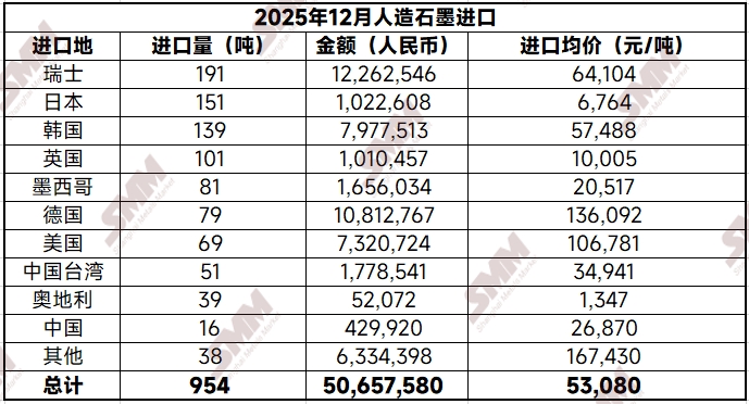 出口方面,2025年12月中国六氟磷酸锂出口量约1330吨,较11月环比上涨约48.6%,同比下降约37.9%。具体来看,日本、捷克和马来西亚出口量环比均有所下降 —— 其中出口日本 122.6 吨,环比下降约 13.81%;出口捷克 58.5吨,环比下降约25%;出口马来西亚24.536吨,环比下降约73.37%。而出口到美国的量级则有所上涨 —— 出口美国 315.021 吨,环比上升约 78.69%。 总体而言,12月国外对六氟磷酸锂采购量有所上涨。 》【SMM分析】2025年12月六氟磷酸锂出口量环比上涨约48.6% 人造石墨 2025年12月,中国人造石墨进口量为954吨,环比增加39.9%,同比下降14.5%。进口均价方面,2025年12月,中国人造石墨进口均价为53080元/吨,环比上涨12.4%,同比上涨335%。