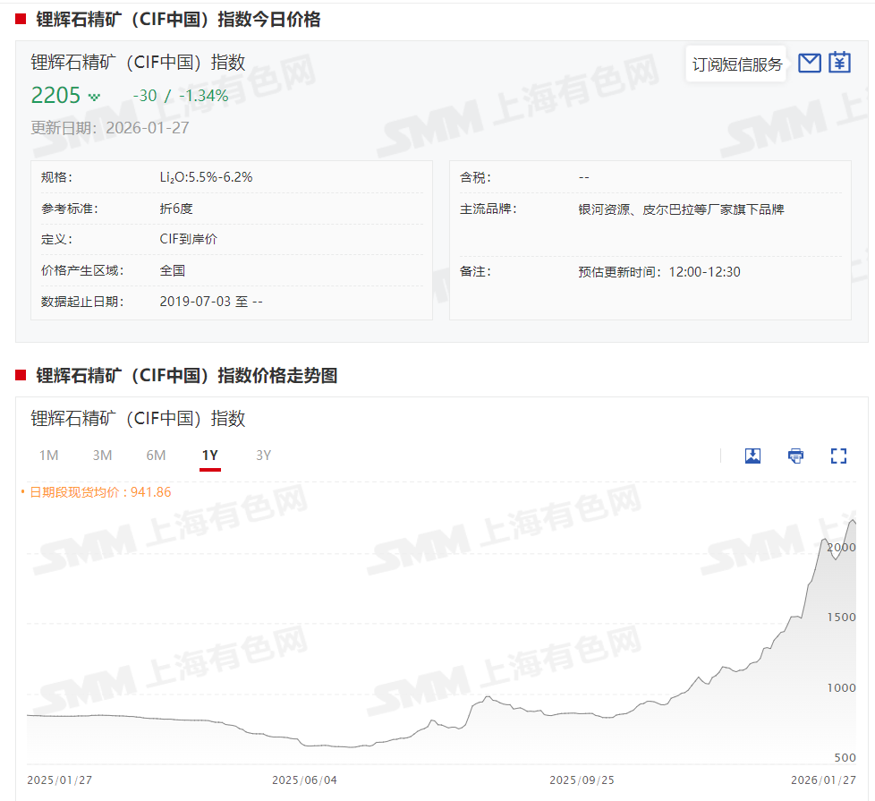 数据来源:中国海关,SMM整理 海关最新数据显示,2025年中国进口锂矿775.06万吨,经SMM筛选可以看出,锂精矿进口量级同比增加约9%,主由非洲锂精矿出口占比增大及澳大利亚矿山放量增多所致。 》【SMM分析】2025年中国进口锂矿775.06万吨 锂精矿进口量级同比增加9% 锂辉石精矿(CIF中国)现货价格方面,据SMM现货报价显示,截至2026年1月27日,锂辉石精矿(CIF中国)现货报价维持在2205美元/吨,相加12月初的1190美元/吨上涨1015美元/吨,涨幅达85.29%。