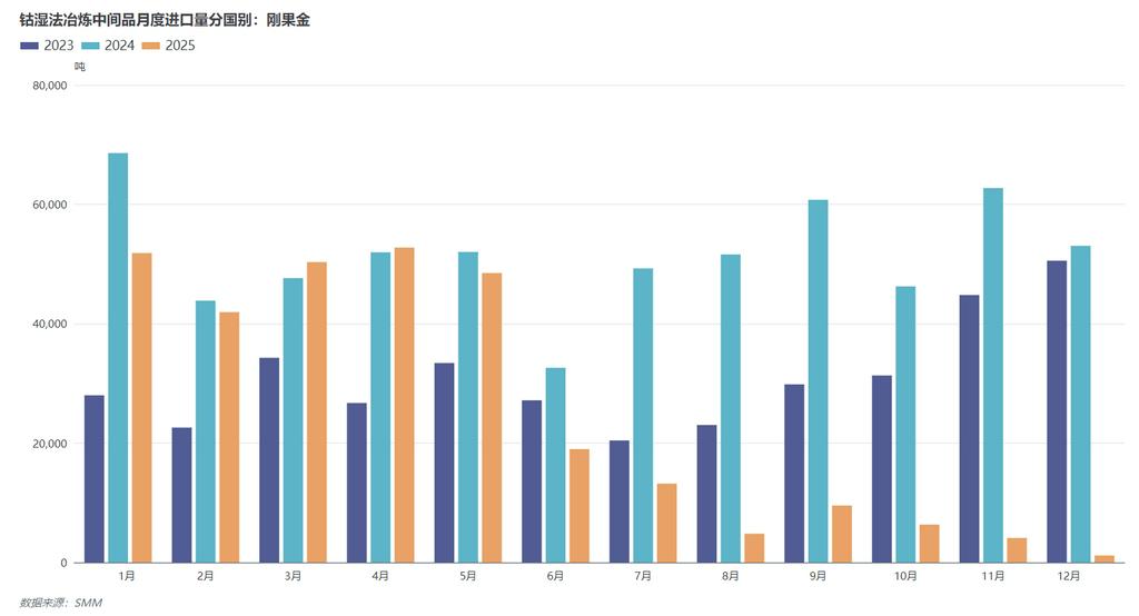 》2025年12月磷矿石进口量减价涨 进口总量环减24.2%均价环增13.5%【SMM分析】 钴方面 钴湿法冶炼中间品 2025年12月中国钴湿法冶炼中间品进口量约为1879实物吨,环比下降65%,同比下降96%,其中从刚果金进口量约为1162实物吨,环比下降72%,同比下降98%。2025年12月中国钴湿法冶炼中间品进口均价为12547美元/实物吨,环比上涨23.48%。2025年全年中国累计进口310,867实物吨,累计同比下降50.54%。根据最新的刚果金出口进度,1月中旬刚果金已完成少批量试点货物的出口审批,其余企业正在缓步推进流程,但考虑到当前配额政策下较长的出口流程,以及刚果金到中国接近3个月的运输周期,预计在2026年4月前,中国的钴中间品进口量仍将长期处于偏低水平。