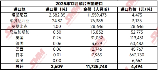 2025年12月,中国人造石墨出口量为44436吨,环比增加3.4%,同比下滑24%。出口均价方面,2025年12月,中国人造石墨出口均价为5715元/吨,环比下滑25.5%,同比降低35.3%。 12月,下游电芯企业需求仍显旺盛,负极厂商更倾向于聚焦本土市场供货,因此分配给出口的产能有限。同时,近年来,海外贸易壁垒的不断升级,推动锂电用人造石墨负极材料出口量级同比大幅下滑。 》【SMM分析】12月人造石墨内需旺盛压制出口 鳞片石墨 2025年12月,中国鳞片石墨进口量为2609吨,环比出现43%的下滑,同比下跌17%。