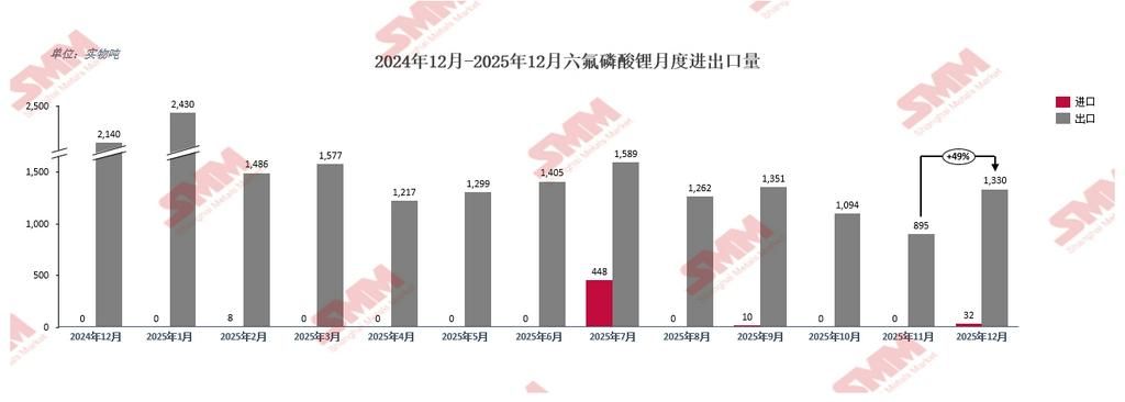 年末前驱体出口需求骤降,主要受海外三元电池市场需求整体走弱影响。美国市场受电动汽车补贴退坡及关税政策调整冲击,电动车销量明显下滑,导致部分整车厂、电池厂与韩国头部电芯企业的合作项目取消,进而传导至韩国正极材料厂对前驱体的采购需求。目前美国政策环境回暖的可能性较低,多家厂商已将原规划的三元电池产能转向磷酸铁锂路线,后续美国市场对三元材料的需求预期趋于谨慎,日韩电池企业面向该市场的订单前景亦不容乐观。 相比之下,欧洲市场仍存积极信号。欧盟委员会于今年1月12日发布的《中国电动车价格承诺书指导文件》,以及德国政府同期重启电动汽车购置补贴政策,均在某种程度上缓解了中国车企的出口压力,有助于稳定市场信心。随着后续更多中国正极材料企业与电池企业的海外基地陆续投产,三元前驱体对欧洲市场的出口规模有望实现增长。 》【SMM分析】2025年12月三元前驱体出口数据解读 六氟磷酸锂 根据中国海关数据显示,2025年12月,中国六氟磷酸锂累计出口量约1330吨,环比上涨约48.6%,中国六氟磷酸锂累计进口量约32吨。